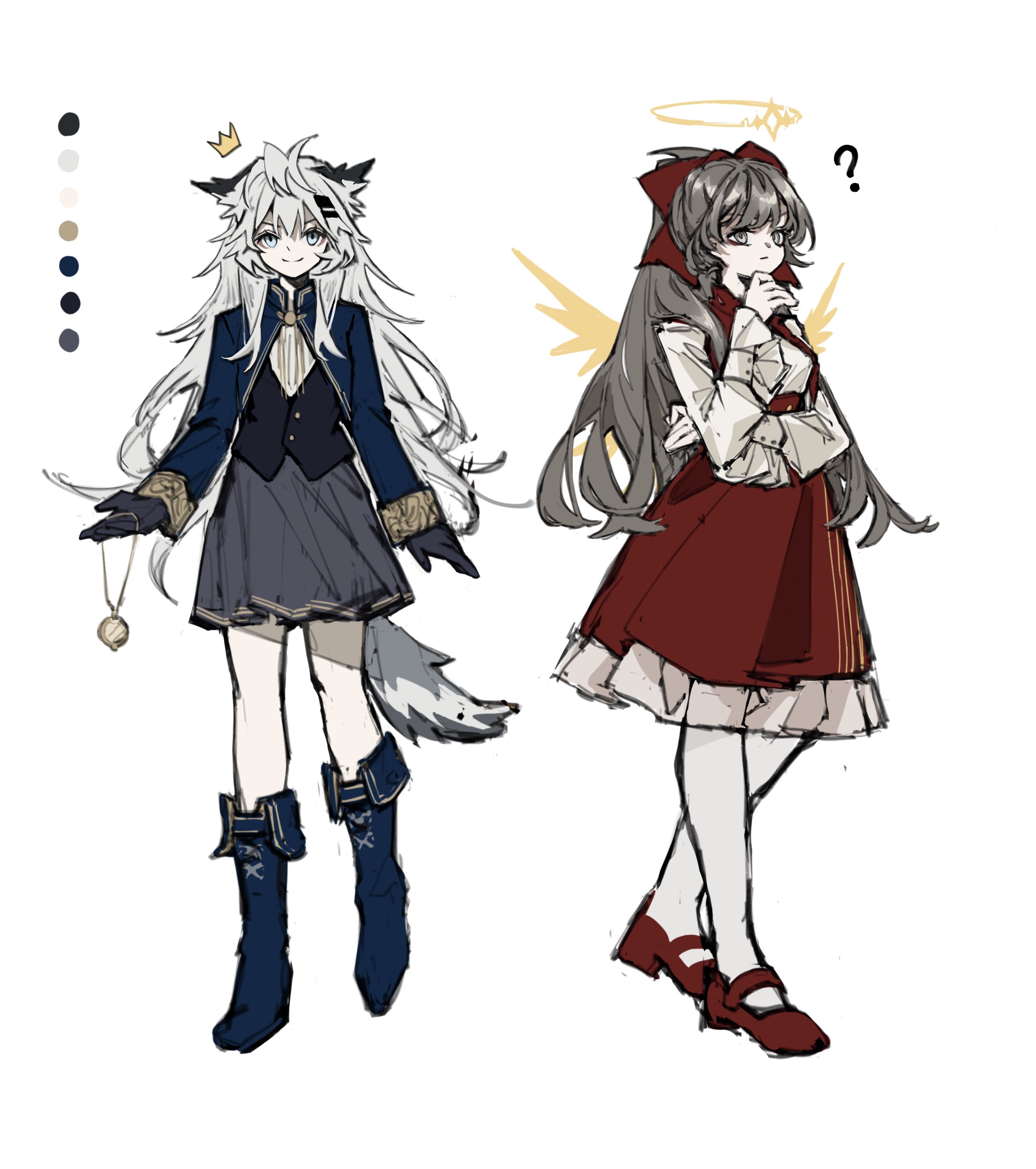 2girls ? absurdres animal_ears arknights black_boots black_gloves blue_eyes boots character_request chinese_commentary closed_mouth color_guide commentary_request crown_(symbol) full_body gloves grey_eyes grey_hair grey_pantyhose grey_tail hair_between_eyes halo hand_on_own_chin highres holding knee_boots lappland_(arknights) long_hair long_sleeves looking_at_viewer martini673_(yui) multiple_girls pantyhose pendant_collar red_shoes shoes smile standing tail wolf_ears wolf_girl wolf_tail yellow_halo