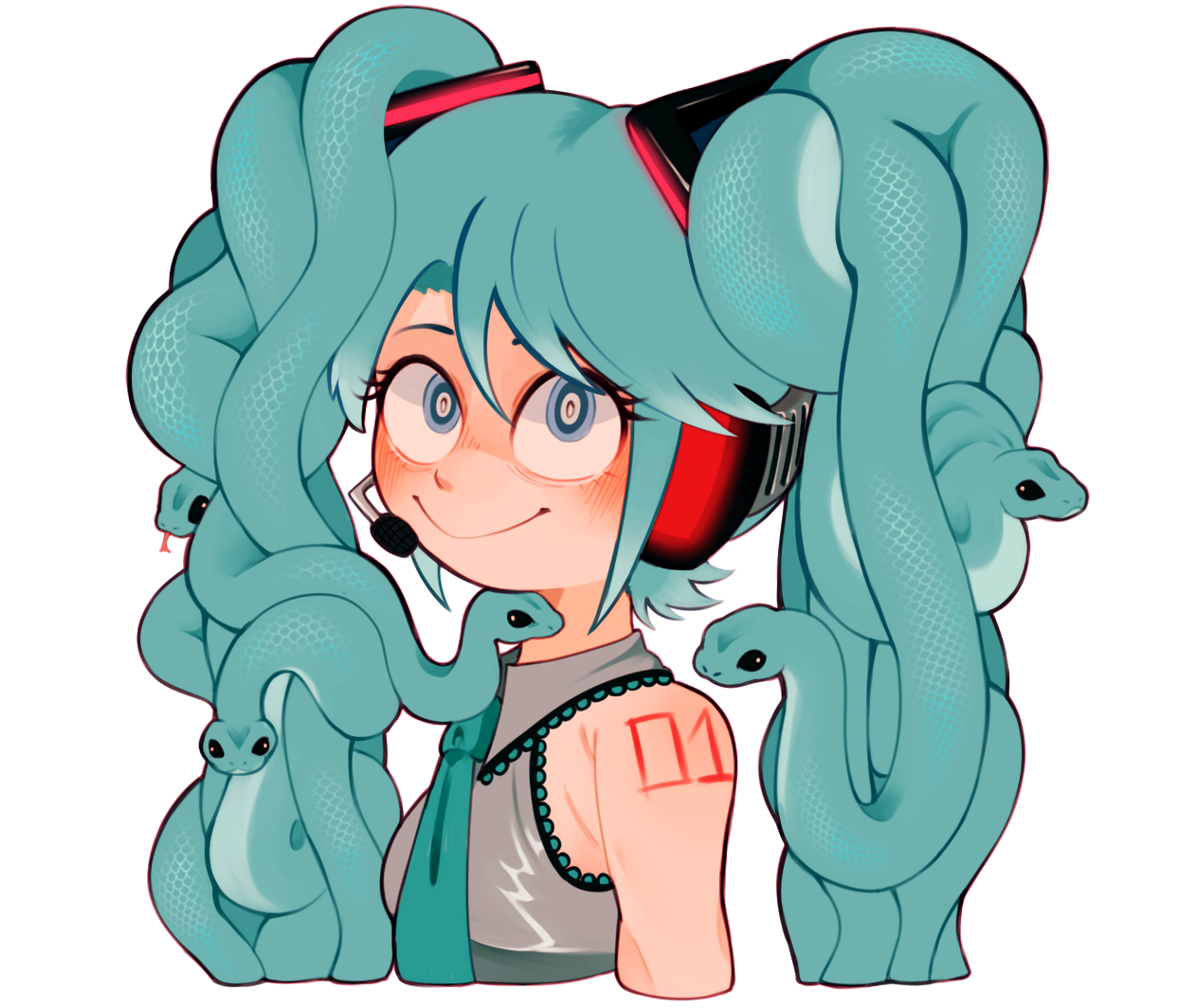1girl aqua_eyes aqua_hair aqua_necktie clem_(calmeremerald) collared_shirt commentary grey_shirt hatsune_miku headset looking_at_viewer looking_up necktie shirt shoulder_tattoo simple_background sleeveless smile snake_hair solo tattoo upper_body vocaloid white_background