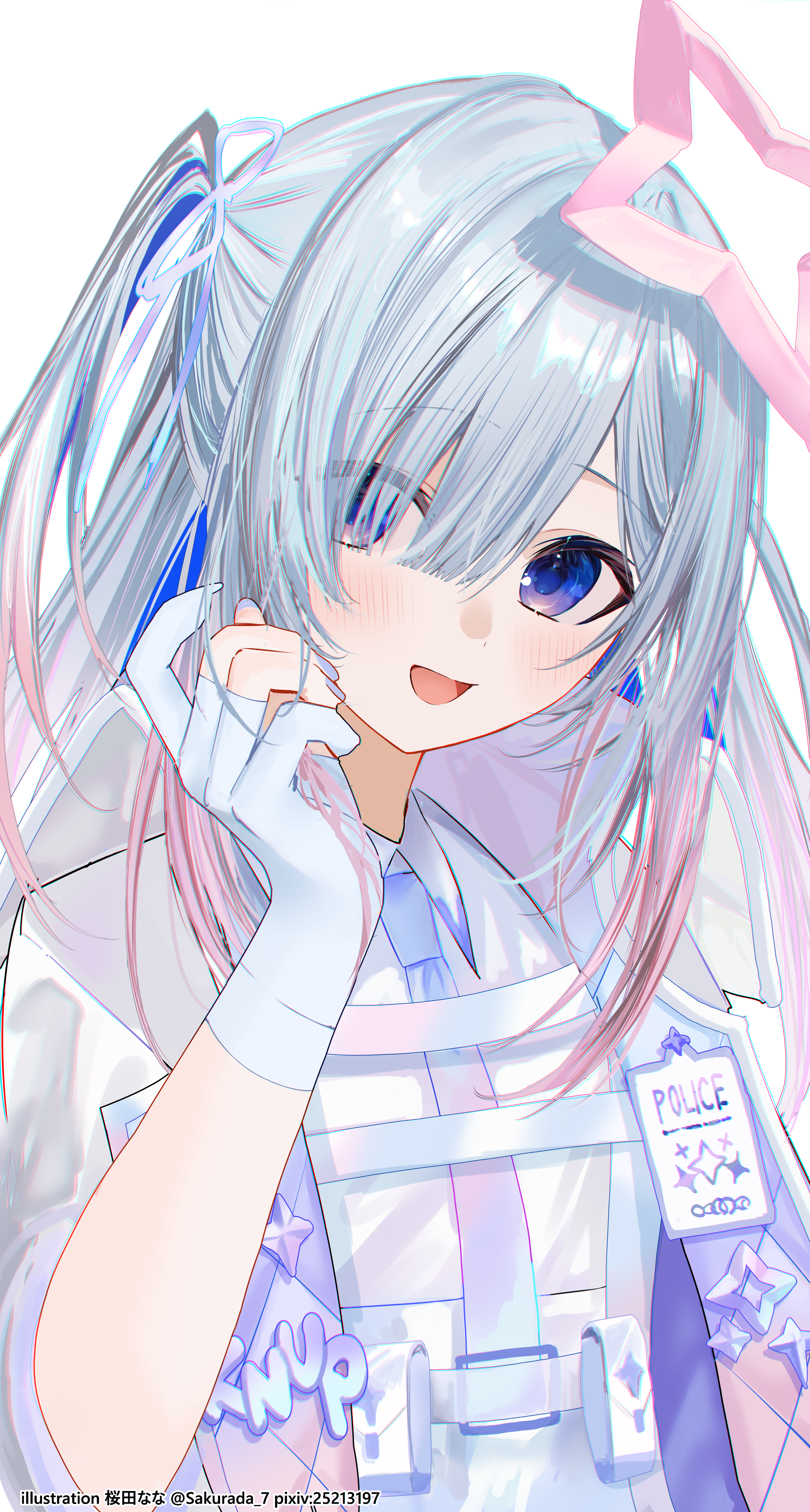 1girl absurdres amane_kanata amane_kanata_(heavenly_guard_mission) blue_nails blue_necktie dress fingerless_gloves gloves grey_hair highres hololive long_hair nail_polish necktie official_alternate_costume one_side_up open_mouth pink_hair purple_eyes sakurada_nana smile solo very_long_hair virtual_youtuber white_background white_dress