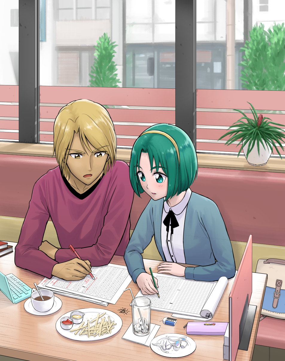 1boy 1girl akimoto_komachi bag blonde_hair blue_jacket blush book brown_eyes coffee computer cup dark-skinned_male dark_skin drinking_glass drinking_straw eraser food french_fries green_eyes green_hair hairband highres holding holding_pen holding_pencil ice itou_shin'ichi jacket ketchup laptop long_sleeves mayonnaise natsu_(precure) nuts_(precure) open_clothes open_jacket open_mouth pen pencil pencil_case plant plate potted_plant precure red_shirt shirt short_hair sitting table two-tone_bag white_shirt window yellow_hairband yes!_precure_5