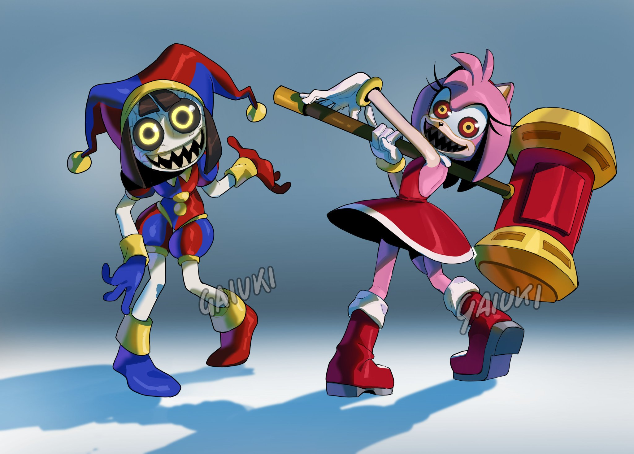 2girls amy_rose boots clown_girl crossover dress fang fangs full_body glitch_productions gloves hammer hat hedgehog_girl highres jester jester_cap looking_at_viewer medium_hair multiple_girls petite pomni_(the_amazing_digital_circus) possessed possession sega smile sonic_(series) sonic_x the_amazing_digital_circus tms_entertainment toy_hammer