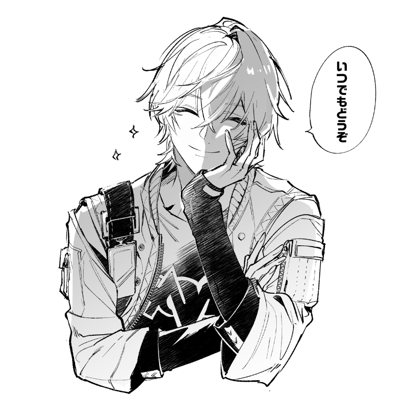 1boy black_shirt closed_eyes closed_mouth crossed_bangs grey_hair greyscale hand_on_own_cheek hand_on_own_face jacket long_sleeves looking_at_viewer monochrome nata_(nata0414) shirt smile translation_request wise_(zenless_zone_zero) zenless_zone_zero