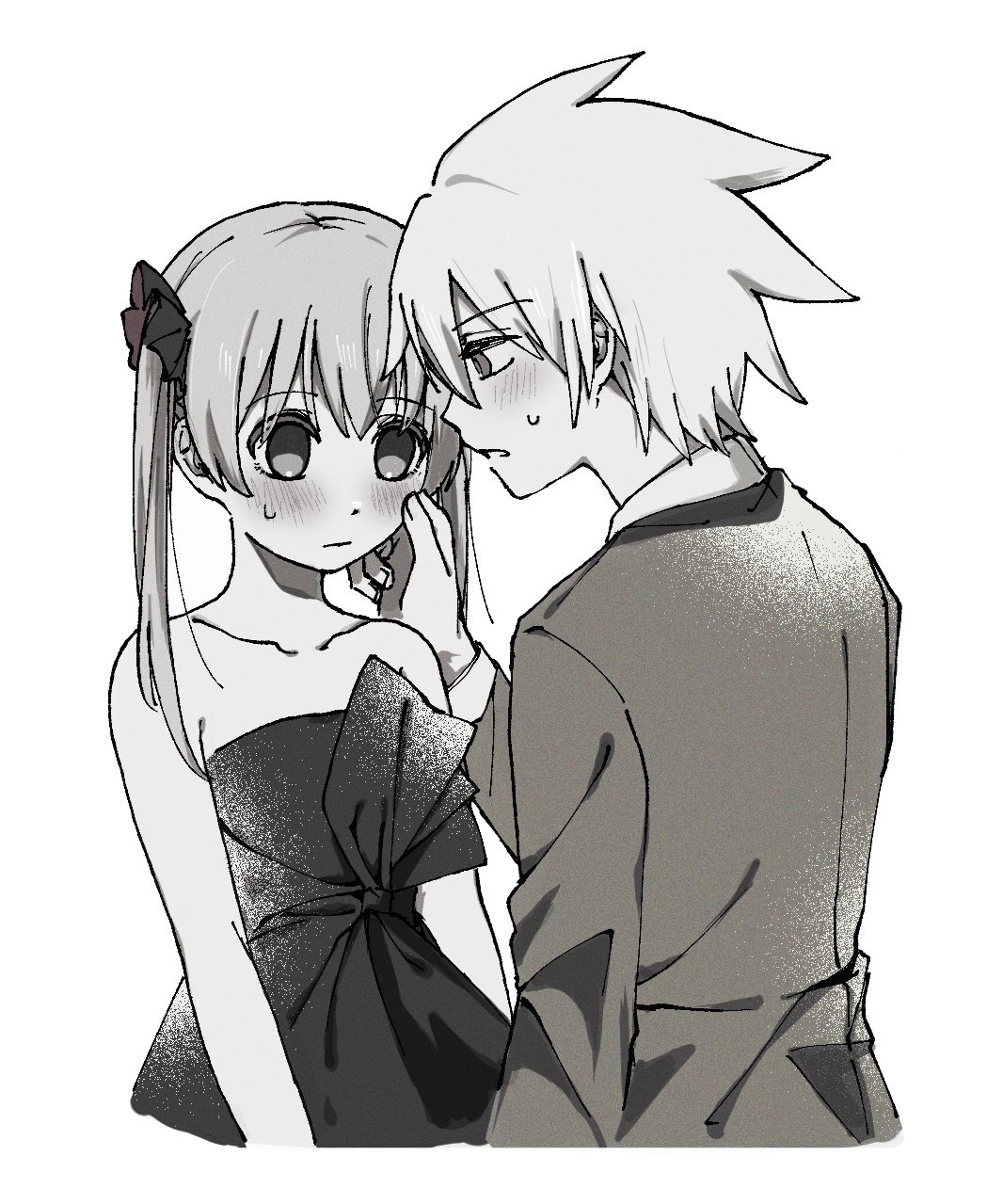 1boy 1girl bare_shoulders black_dress blush bow cheek_pinching dress dress_bow formal_clothes hair_bow highres maka_albarn moka_533 pinching soul_eater soul_evans strapless strapless_dress suit twintails