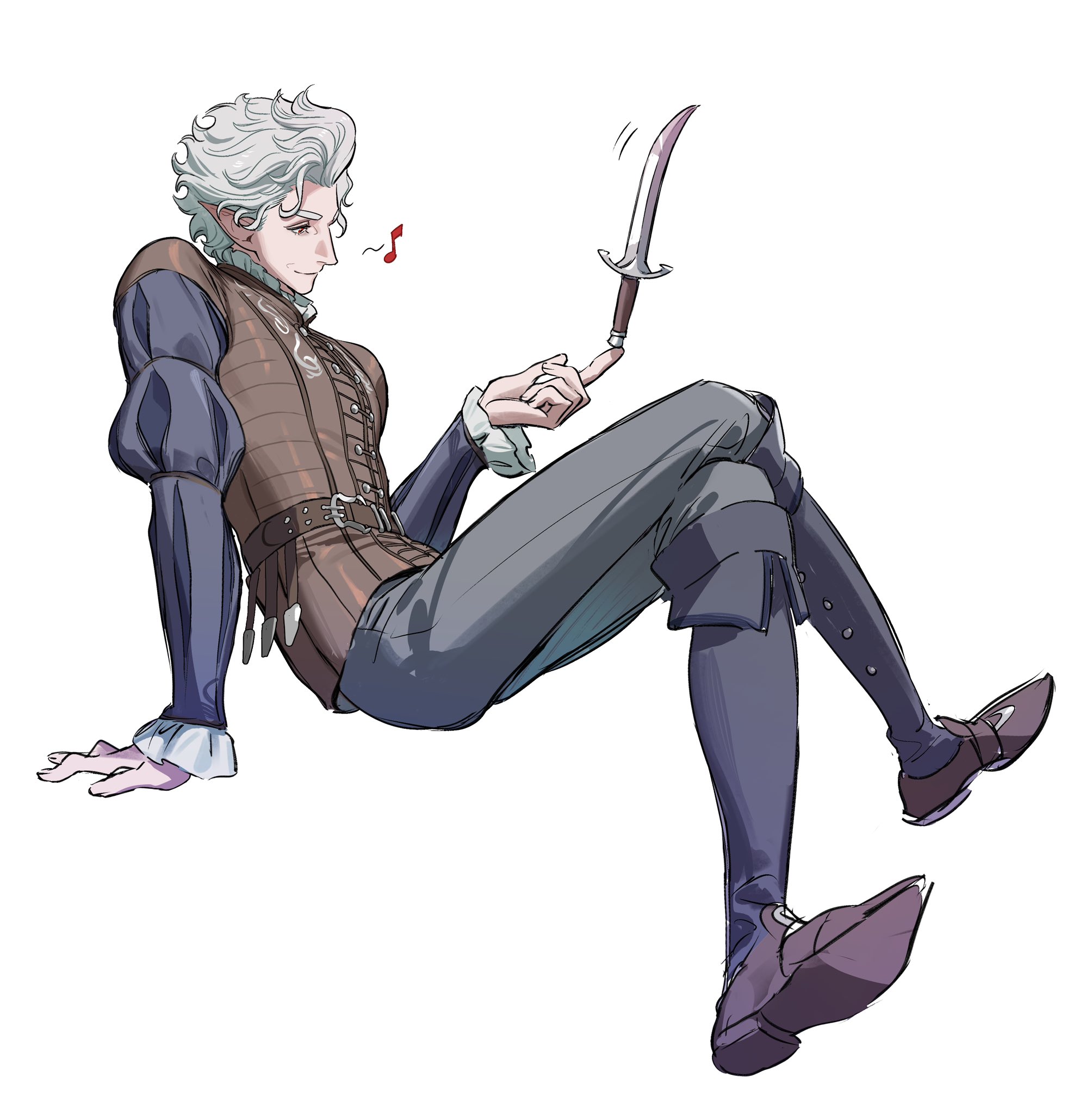 1boy arm_support astarion balancing_on_finger baldur's_gate baldur's_gate_3 belt belt_buckle boots brown_belt brown_tunic buckle closed_mouth collar commentary crossed_legs dagger dress_shoes dungeons_&_dragons dungeons_&_dragons english_commentary frilled_collar frilled_sleeves frills full_body grey_pants hair_slicked_back highres keapriciti knee_boots knife long_sleeves male_focus motion_lines musical_note pants pointy_ears pointy_shoes red_eyes shoes short_hair smile solo tunic wavy_hair weapon white_hair