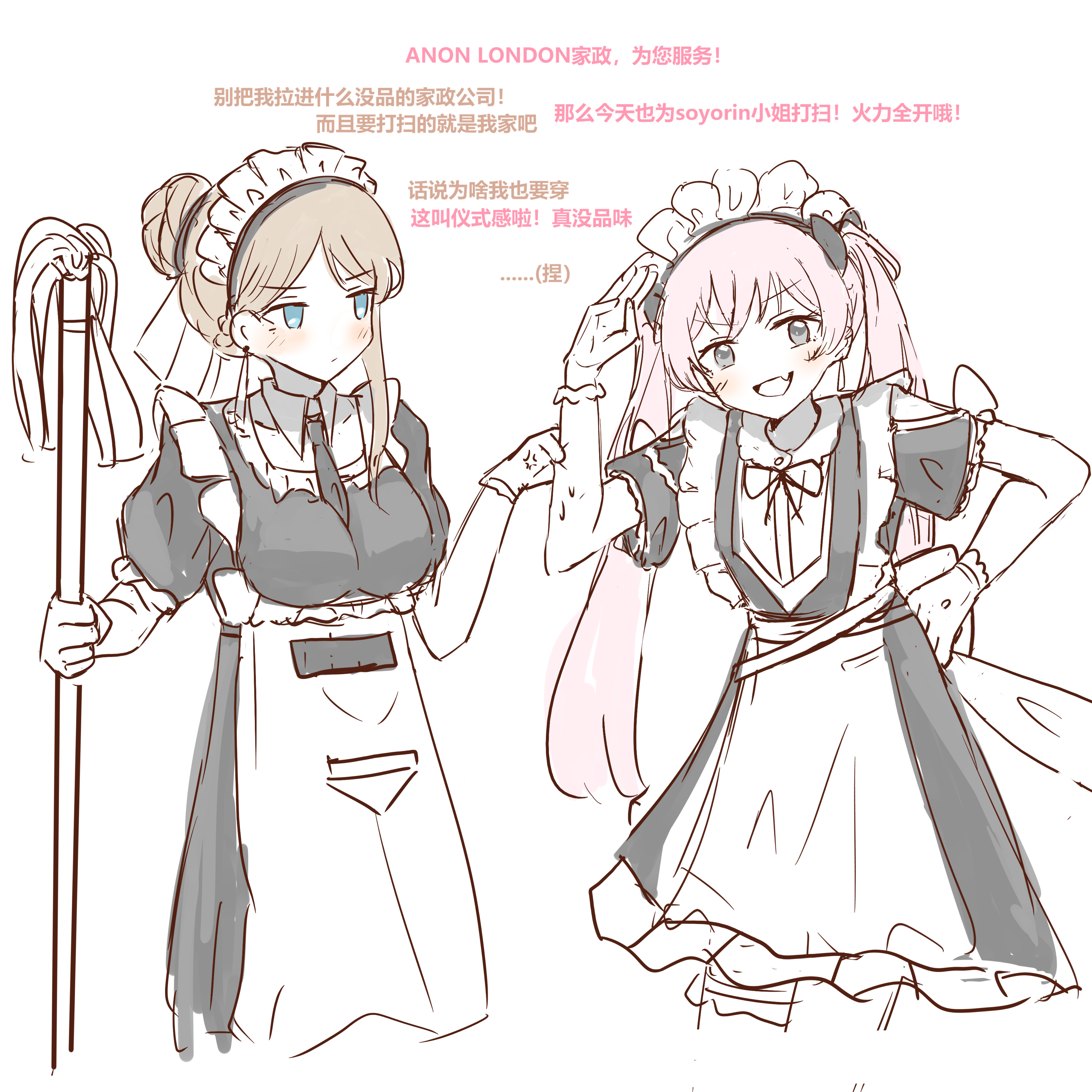 2girls absurdres anger_vein ansy09080527 apron bang_dream! bang_dream!_it's_mygo!!!!! black_dress black_necktie blue_eyes blush breasts chihaya_anon chinese_commentary chinese_text commentary_request dress earrings fang gloves grabbing_another's_arm grey_eyes hair_bun hand_on_own_hip highres holding holding_mop jewelry long_hair maid medium_breasts mop multiple_girls nagasaki_soyo necktie open_mouth pink_hair salute short_sleeves single_earring single_hair_bun single_sidelock skin_fang translation_request twintails waist_apron white_apron white_gloves
