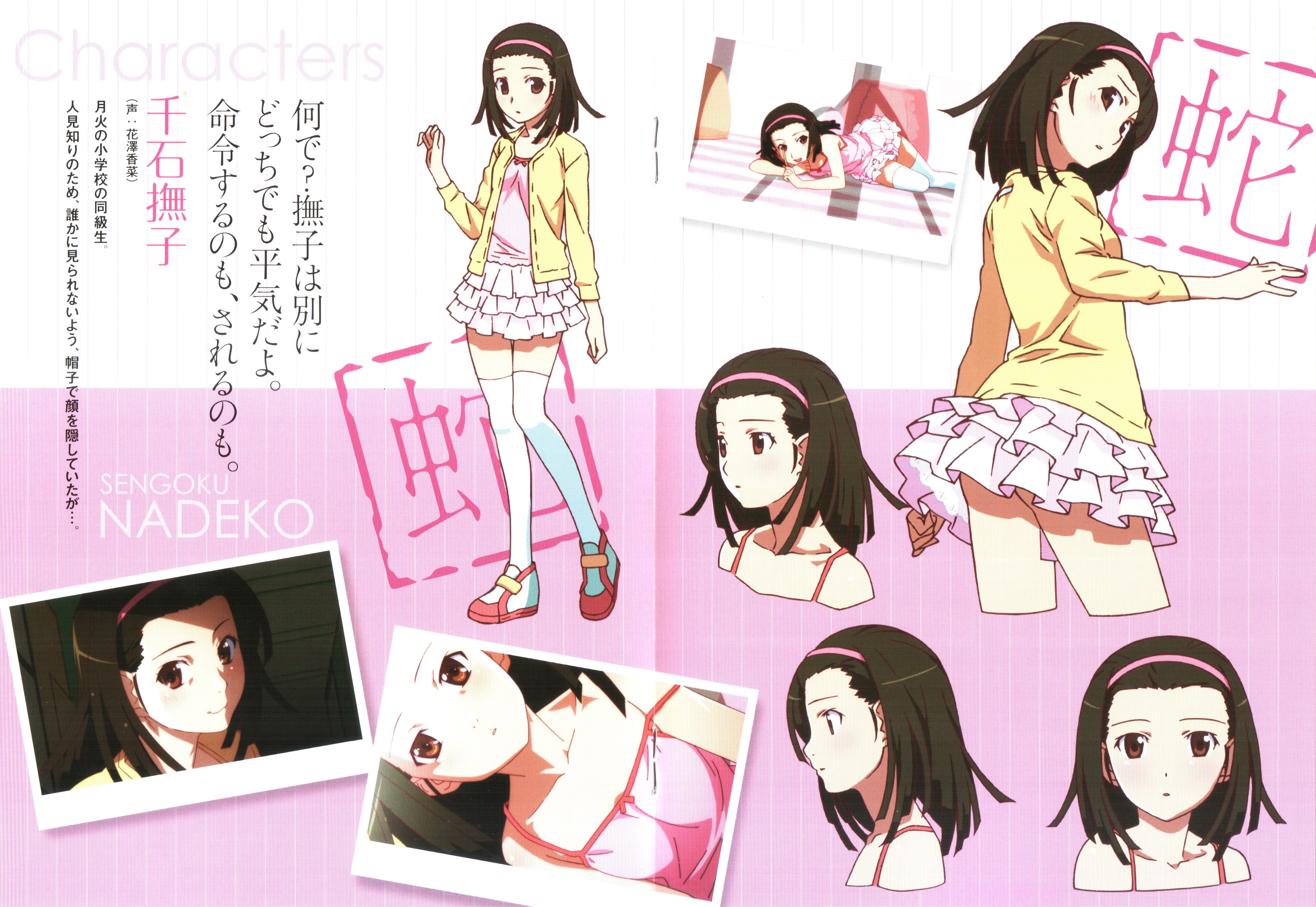1girl absurdres bare_shoulders breasts brown_eyes brown_hair camisole collarbone female_focus flat_chest hairband hairbraid highres jacket legs looking_at_viewer looking_back lying monogatari_(series) on_stomach pink_camisole pink_hairband sengoku_nadeko shoes short_hair single_off_shoulder skirt sleeves_past_wrists small_breasts smile solo solo_focus standing thighhighs thighs white_shoes white_skirt white_thighhighs yellow_jacket