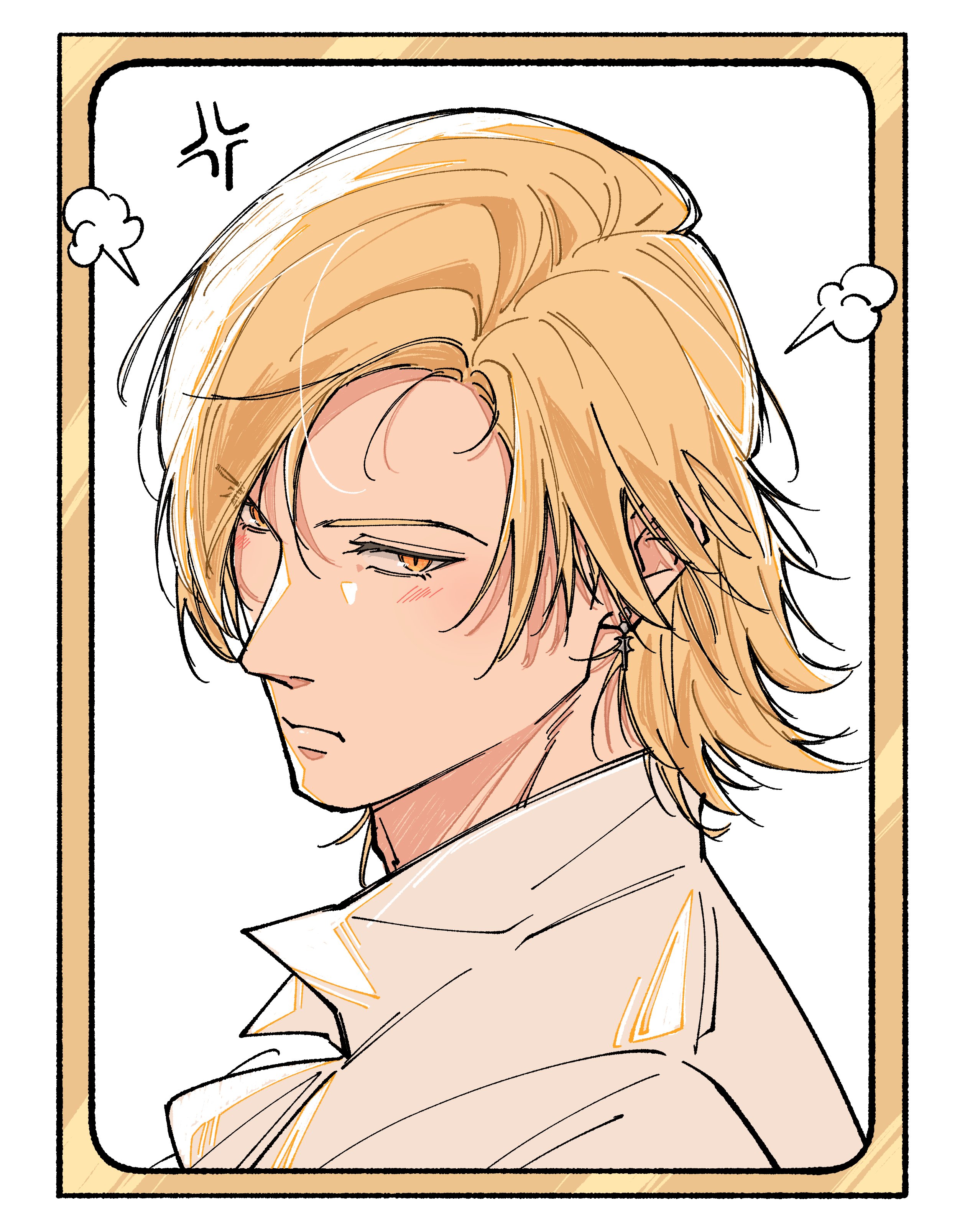1boy :i absurdres anger_vein blonde_hair border closed_mouth collared_shirt dion_lesage final_fantasy final_fantasy_xvi highres looking_to_the_side male_focus parted_bangs popped_collar portrait puff_of_air shinya572 shirt sideways_glance solo upper_body white_background white_shirt yellow_border yellow_eyes
