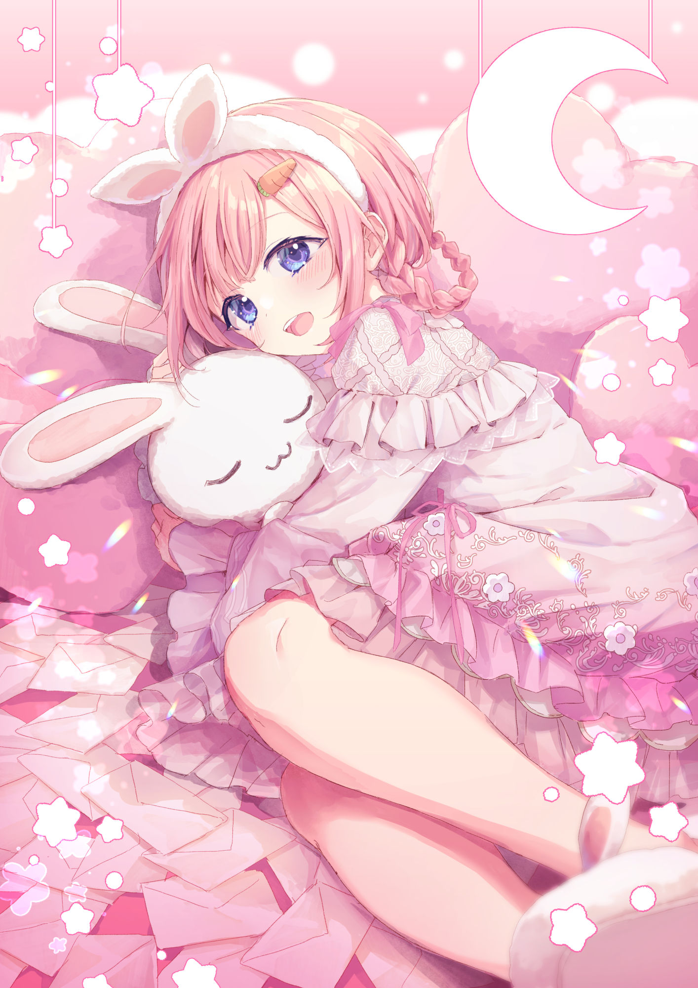 1girl animal_ears blue_eyes blush braid carrot_hair_ornament fake_animal_ears food-themed_hair_ornament hair_ornament hairband highres looking_at_viewer lying nijisanji open_mouth pink_hair rabbit shiohari_kanna solo stuffed_animal stuffed_toy suo_sango suo_sango_(2nd_costume) teeth upper_teeth_only virtual_youtuber
