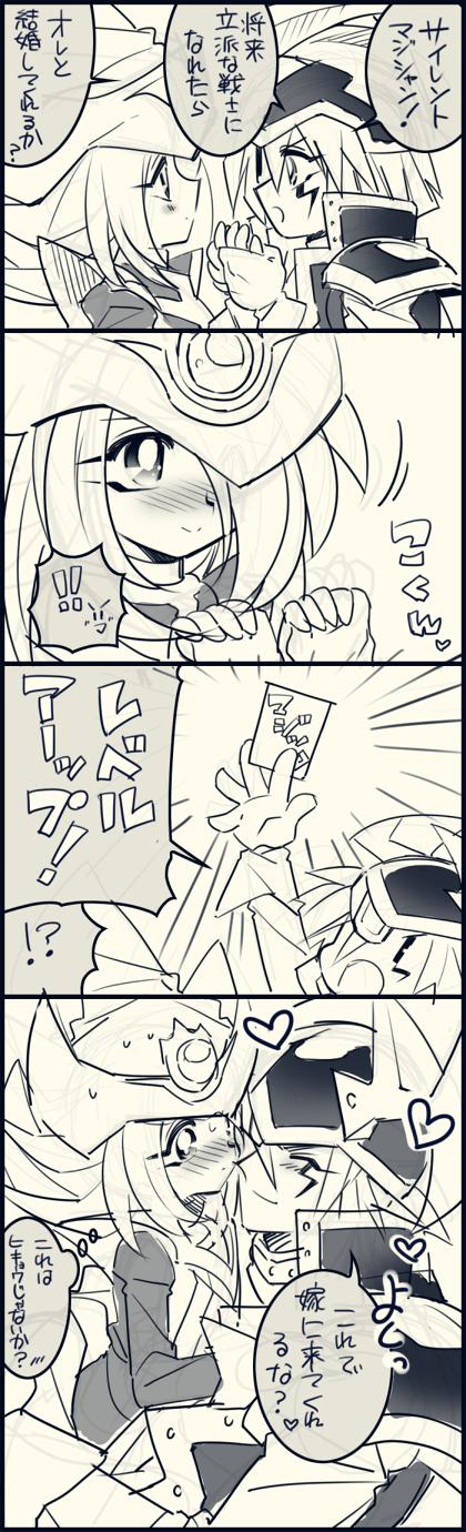 1boy 1girl blush closed_eyes duel_monster fake_horns gloves hair_over_one_eye hat heart helmet highres horned_helmet horns long_hair misaka_(missa) silent_magician silent_magician_lv4 silent_swordsman silent_swordsman_lv3 smile speech_bubble white_hat wizard_hat yu-gi-oh!