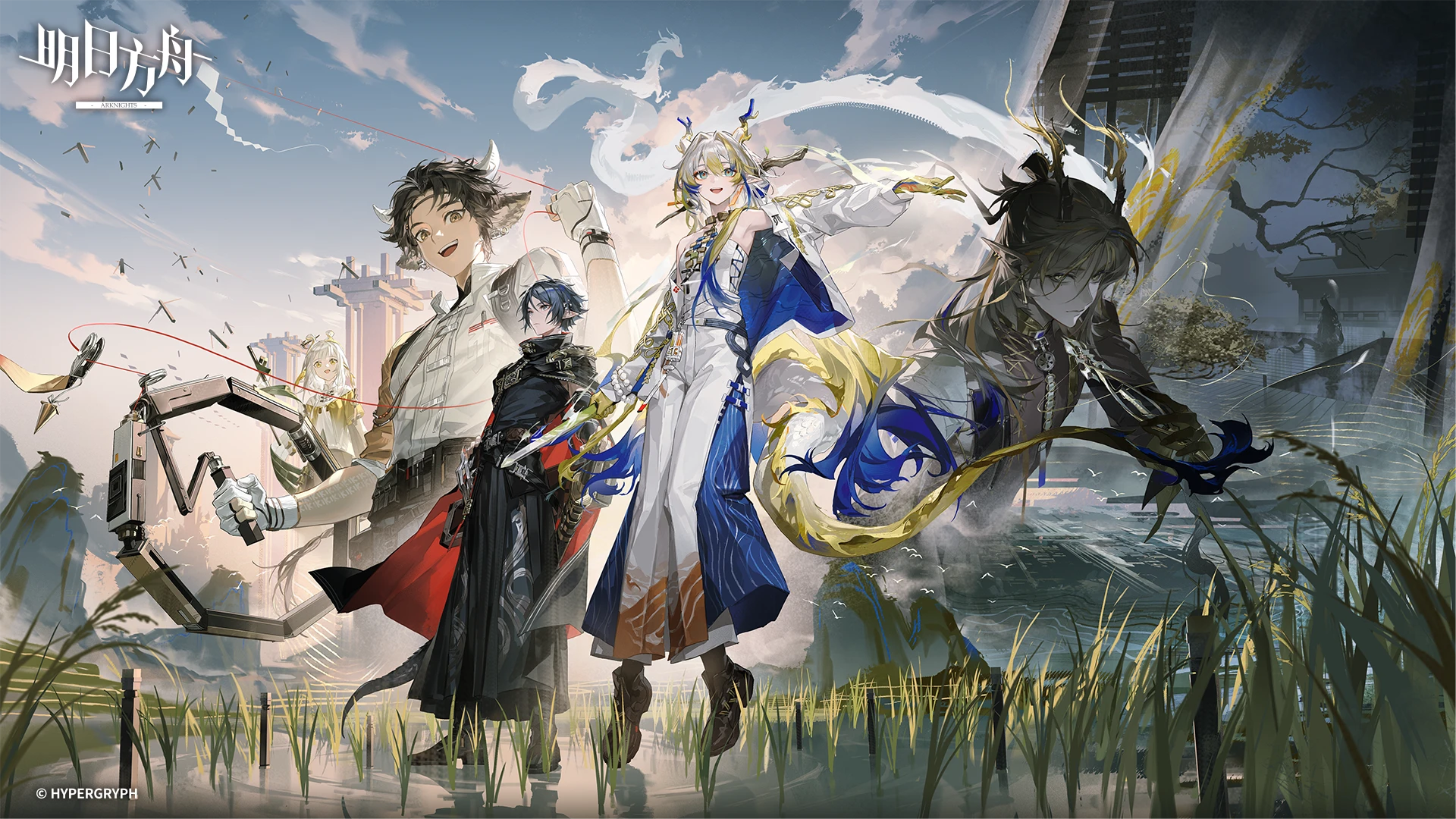 2girls 4boys animal_ears arknights blue_sky earrings field gloves grain_buds_(arknights) highres holding holding_weapon horns jacket jewelry ji_(arknights) long_sleeves looking_at_viewer multiple_boys multiple_girls official_art pointy_ears rice_paddy shu_(arknights) sky tail tree wan_qing_(arknights) wang_(arknights) weapon white_gloves zuo_le_(arknights)