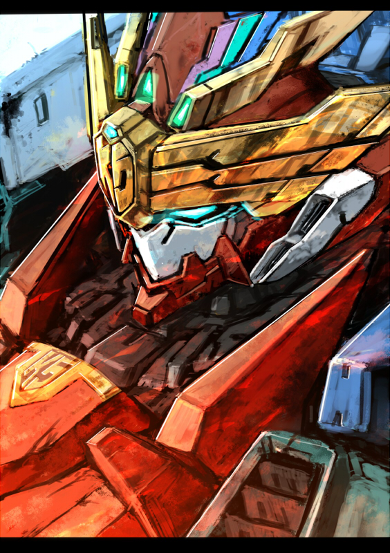 armor blue_eyes close-up glowing glowing_eyes maximum_kizuna_kaiser mecha ra_(pixiv120326) red_armor robot sentai_red_isekai_de_boukensha_ni_naru solo