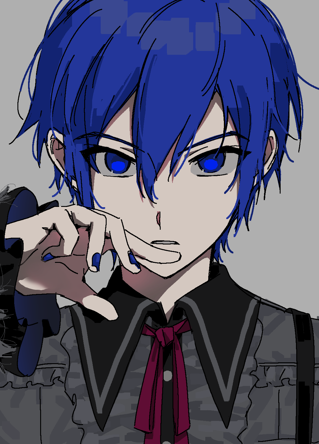 1boy 25-ji_kaito blue_eyes blue_hair blue_nails collared_shirt commentary_request demisoda_(thekepalthek) double-parted_bangs fingernails grey_background hand_up highres kaito_(vocaloid) korean_commentary long_sleeves looking_at_viewer male_focus nail_polish neck_ribbon parted_lips project_sekai red_ribbon ribbon shirt short_hair simple_background solo