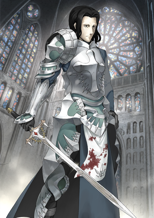 1boy armor black_eyes black_gloves black_hair blood blood_on_clothes breastplate church clenched_hand closed_mouth cross fate/grand_order fate_(series) faulds feet_out_of_frame frown full_armor gilles_de_rais_(fate) gilles_de_rais_(saber)_(fate) gloves hand_on_own_hip holding holding_sword holding_weapon indoors long_hair looking_at_viewer male_focus official_art parted_bangs pauldrons shinjirou shoulder_armor single_pauldron solo stained_glass standing sword third-party_source vambraces weapon white_armor window