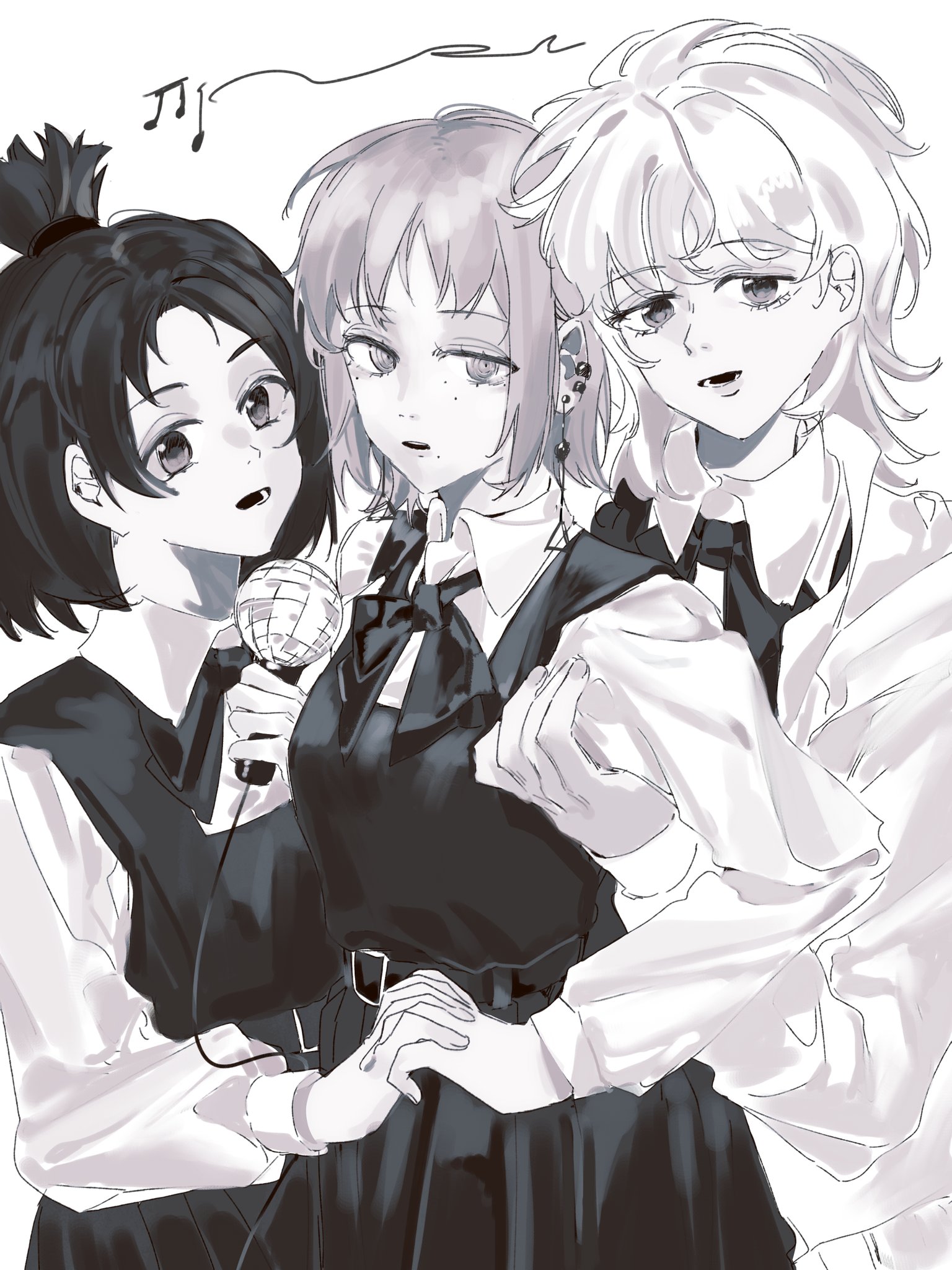 3girls chainsaw_man character_request collared_shirt commentary_request dress earrings fami_(chainsaw_man) fourth_east_high_school_uniform greyscale highres holding holding_microphone jewelry looking_at_viewer medium_hair microphone mole mole_under_eye monochrome multiple_girls multiple_moles musical_note neck_ribbon pinafore_dress ribbon ringed_eyes school_uniform shirt sleeveless sleeveless_dress topknot yijiao_wuran