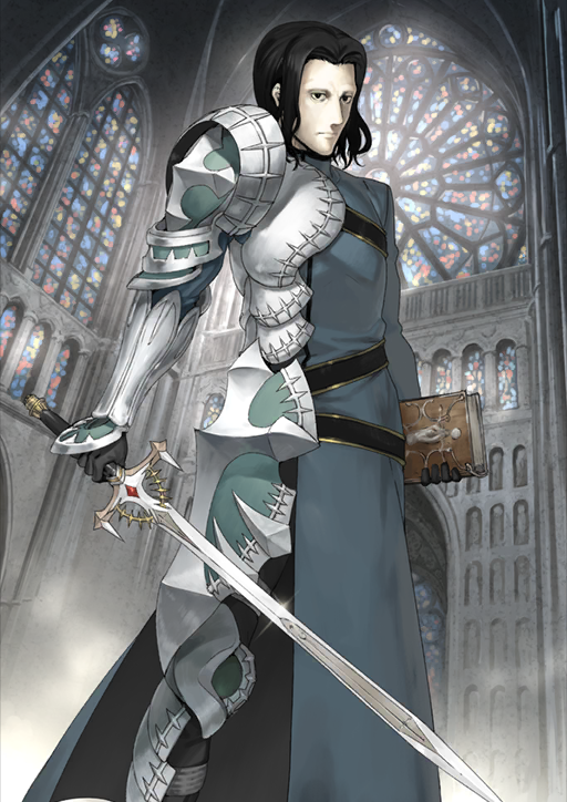 1boy armor black_eyes black_gloves black_hair book cassock church clenched_hand closed_mouth cross fate/grand_order fate_(series) feet_out_of_frame frown gilles_de_rais_(fate) gilles_de_rais_(saber)_(fate) gloves holding holding_book holding_sword holding_weapon indoors long_hair looking_at_viewer male_focus official_art parted_bangs pauldrons shinjirou shoulder_armor single_pauldron single_vambrace solo stained_glass standing sword third-party_source vambraces weapon white_armor window