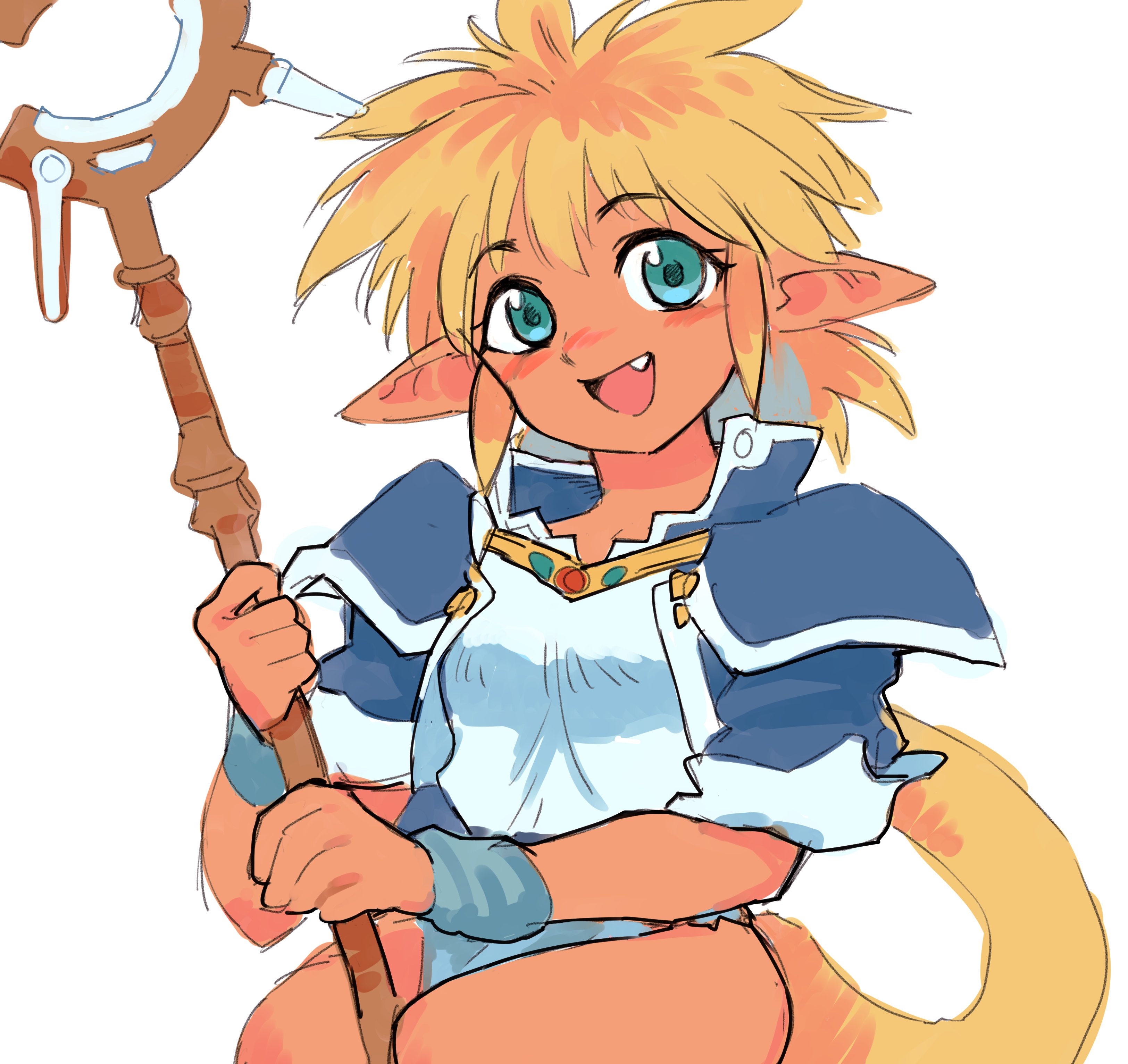 1girl :d absurdres blonde_hair blue_eyes breasts dress fam_(ruin_explorers) fang gan2 highres hikyou_tanken_fam_&_ihrie holding holding_staff medium_breasts medium_hair open_mouth pointy_ears simple_background smile solo staff white_background white_dress yellow_tail