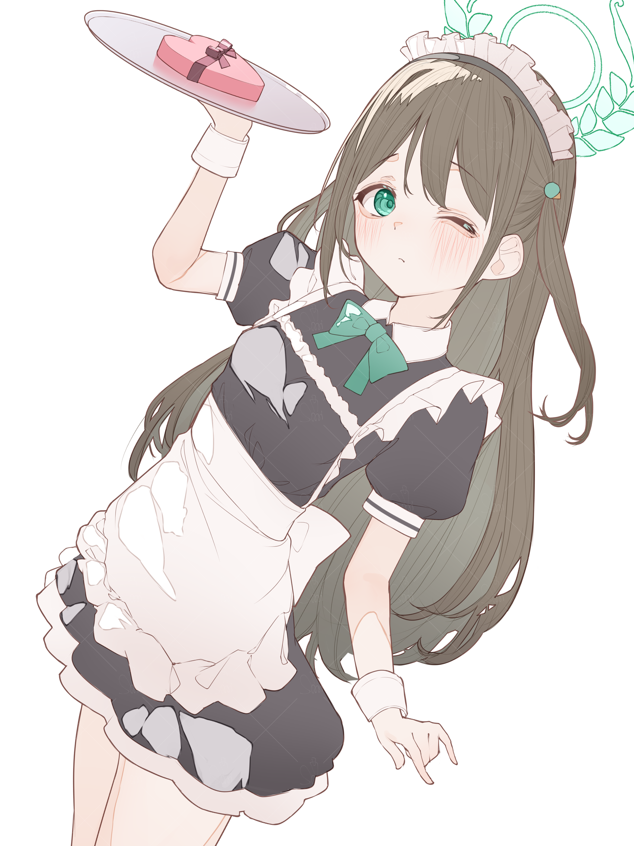 1girl absurdres airi_(blue_archive) apron aqua_halo black_shirt black_skirt blue_archive blush box brown_hair commentary dutch_angle food-themed_hair_ornament frilled_apron frills green_eyes green_halo hair_ornament halo heart-shaped_box highres holding holding_tray ice_cream_hair_ornament long_hair looking_at_viewer maid maid_apron maid_headdress miniskirt puffy_short_sleeves puffy_sleeves shirt short_sleeves skirt solo standing tachibana_shiori_(suica_112) tray two_side_up waist_apron white_apron white_background wrist_cuffs
