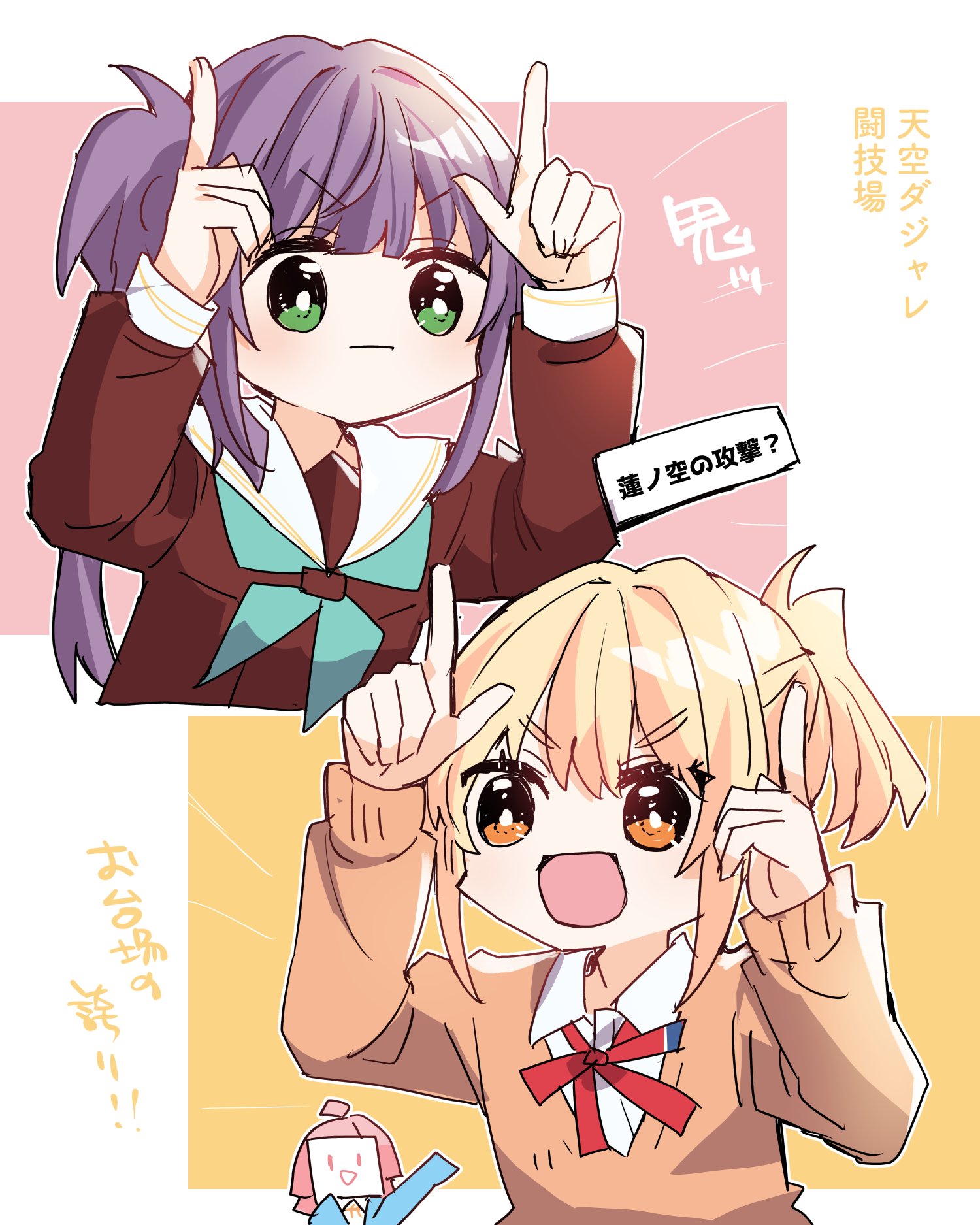 3girls :d ahoge aqua_neckerchief blonde_hair brown_cardigan brown_dress cardigan closed_mouth collared_shirt commentary_request dress dress_shirt green_eyes hangyaku_no_nijigasaki hasu_no_sora_school_uniform highres horns_pose kanduki_kamibukuro kishimen_hair link!_like!_love_live! long_hair long_sleeves love_live! love_live!_nijigasaki_high_school_idol_club medium_hair miyashita_ai multiple_girls neck_ribbon neckerchief nijigasaki_school_uniform open_mouth orange_eyes otomune_kozue pink_hair ponytail purple_hair red_ribbon ribbon rina-chan_board sailor_collar sailor_dress school_uniform shirt side_ponytail sidelocks smile tennoji_rina translation_request v-shaped_eyebrows virtual_youtuber white_sailor_collar white_shirt winter_uniform