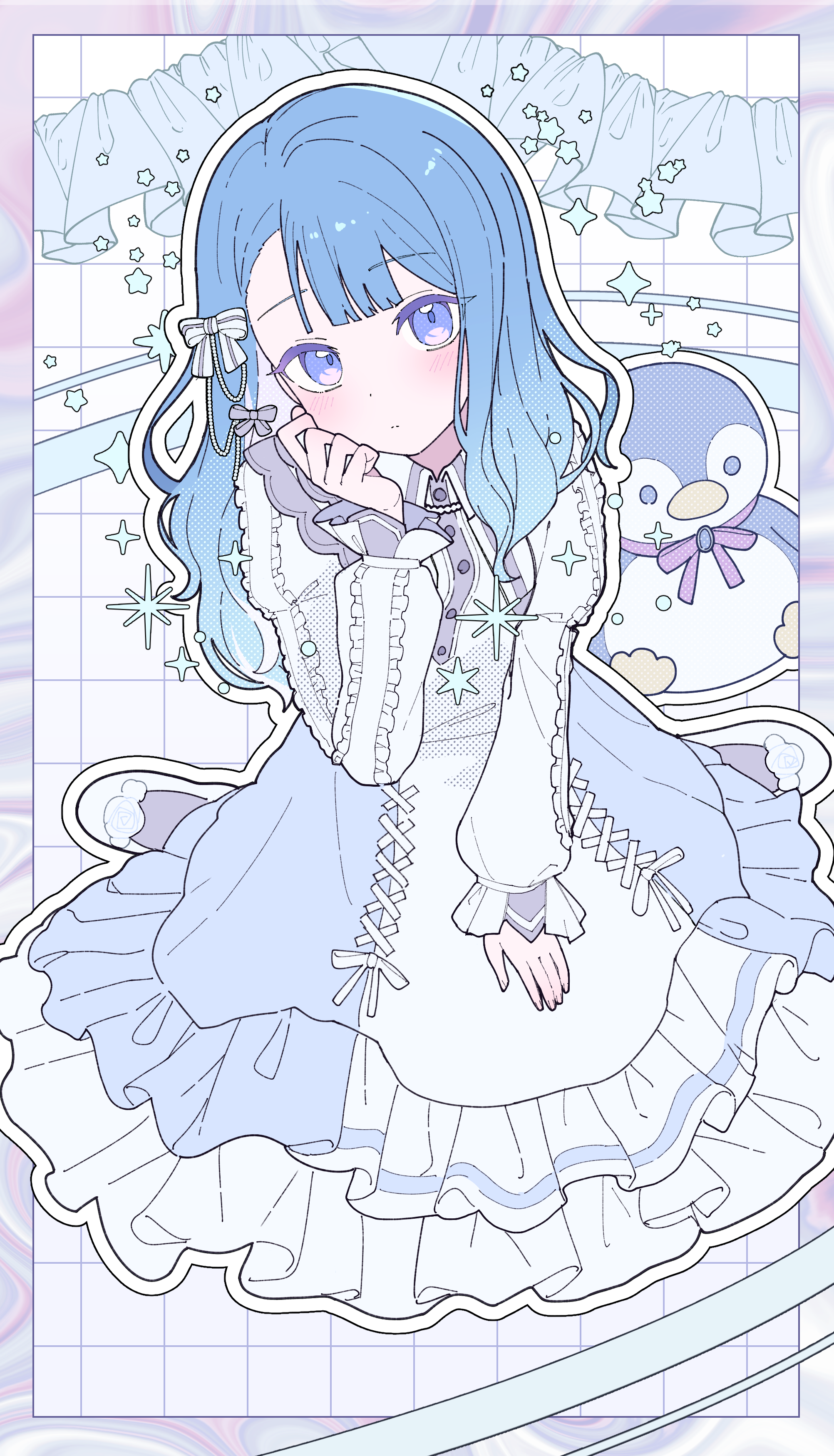 1girl absurdres blue_eyes blue_hair blush border bow buttons closed_mouth commentary_request dress frilled_sleeves frills highres kiritani_haruka long_sleeves looking_at_viewer mishio_(misio_40) more_more_jump!_(project_sekai) project_sekai sleeves_past_wrists solo stuffed_animal stuffed_penguin stuffed_toy white_bow white_dress