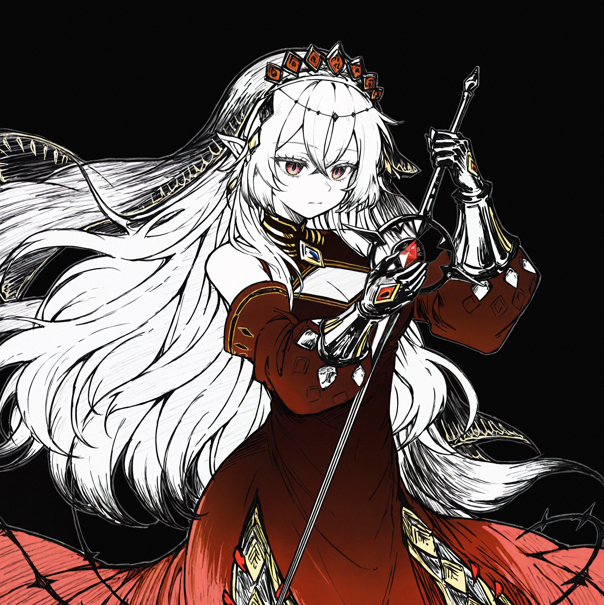 1girl alternate_form arched_crown armor bare_shoulders black_background blazing_cartesia_the_virtuous blue_gem breasts cleavage_cutout clothing_cutout crown dress duel_monster ecclesia_(yu-gi-oh!) facing_to_the_side gauntlets gem hair_ribbon highres holding holding_sword holding_weapon long_hair looking_at_object looking_down looking_to_the_side ownshine partially_colored pointy_ears rapier red_crown red_dress red_eyes red_gem red_sleeves ribbon silver_crown sword thorns weapon white_armor white_hair wind yu-gi-oh!