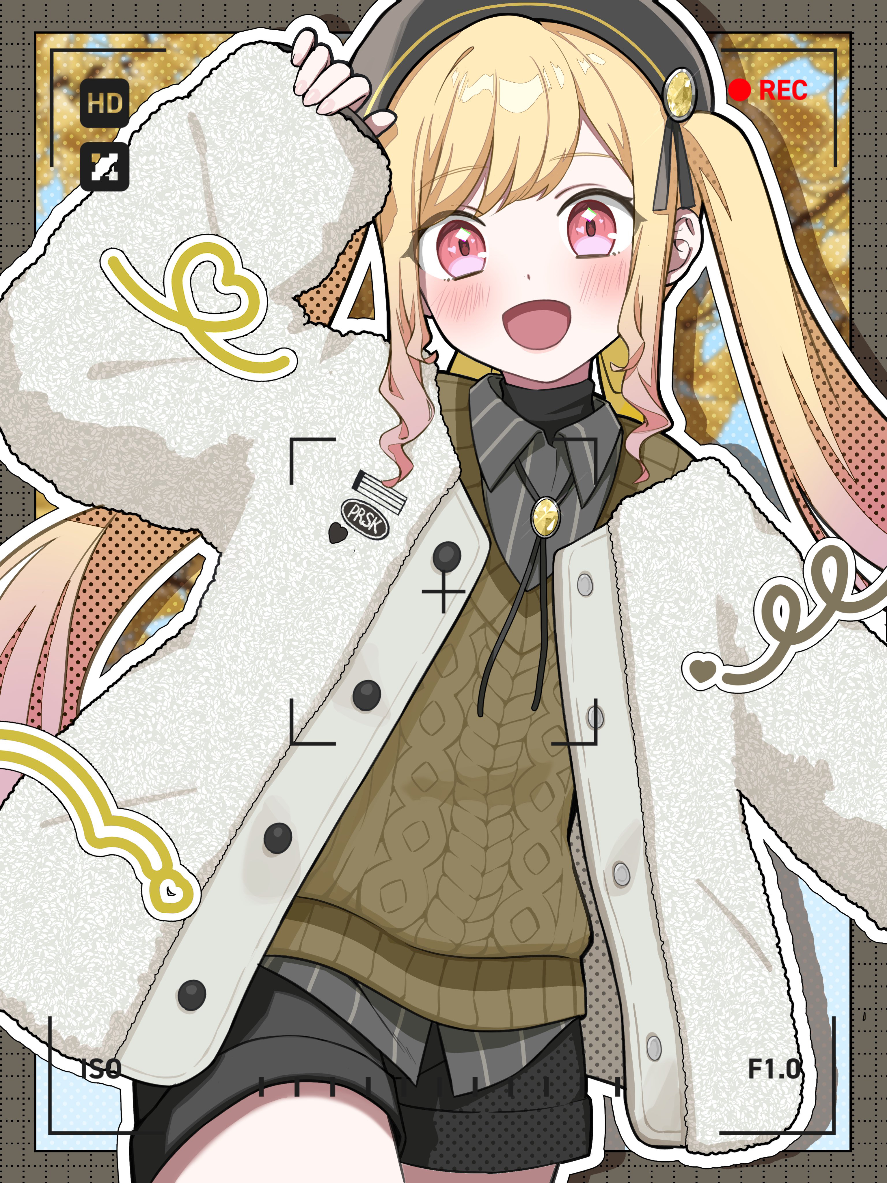 1girl absurdres arm_up black_hair black_shorts blonde_hair bolo_tie brown_sweater coat diamond_in_eye fur_coat gem grey_shirt highres long_sleeves looking_at_viewer mishio_(misio_40) open_mouth outline outside_border project_sekai recording shirt shorts sidelocks sleeves_past_wrists solo sweater tenma_saki twintails white_outline yellow_gem