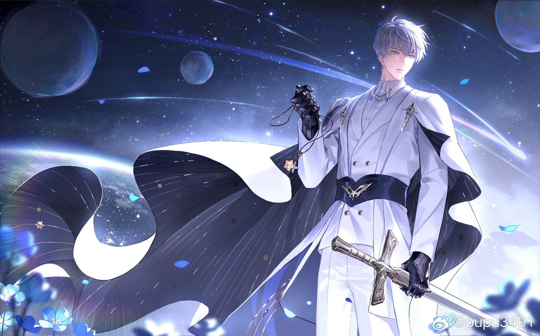 1boy belt black_gloves blue_background blue_flower cape coat flower gloves grey_belt grey_eyes grey_hair hair_between_eyes highres knight love_and_deepspace male_focus medallion moon_phases panties pupu_yuanwei_pu_pu short_hair solo star_pendant underwear watermark weibo_watermark white_cape white_coat white_panties xavier_(love_and_deepspace)