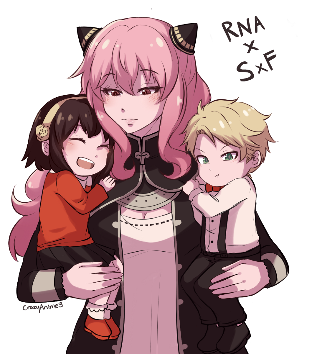 1boy 2girls aged_down artist_name ashe_(rengoku_no_ashe) black_coat black_hair black_pants black_shorts black_skirt blonde_hair bow bowtie breasts carrying carrying_person child cleavage closed_eyes closed_mouth coat commentary crazyanime3 cross english_commentary gold_hairband green_eyes hairband hairpods highres long_hair multiple_girls open_mouth pants pink_hair pout red_bow red_bowtie red_eyes red_shirt red_shoes rengoku_no_ashe shirt shoes short_hair shorts simple_background skirt smile socks spy_x_family teeth twilight_(spy_x_family) upper_body upper_teeth_only white_background white_shirt white_socks yor_briar