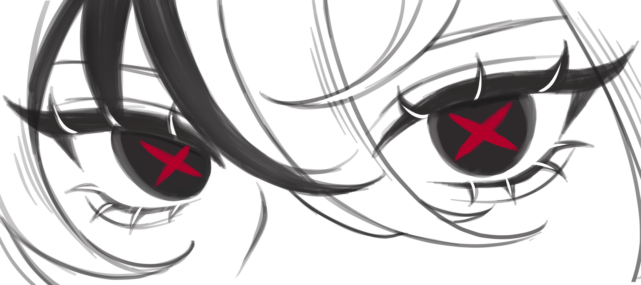 1girl arlecchino_(genshin_impact) charlie_purrito close-up commentary english_commentary eyelashes genshin_impact hair_between_eyes highres limited_palette red_pupils solo spot_color symbol-shaped_pupils x-shaped_pupils