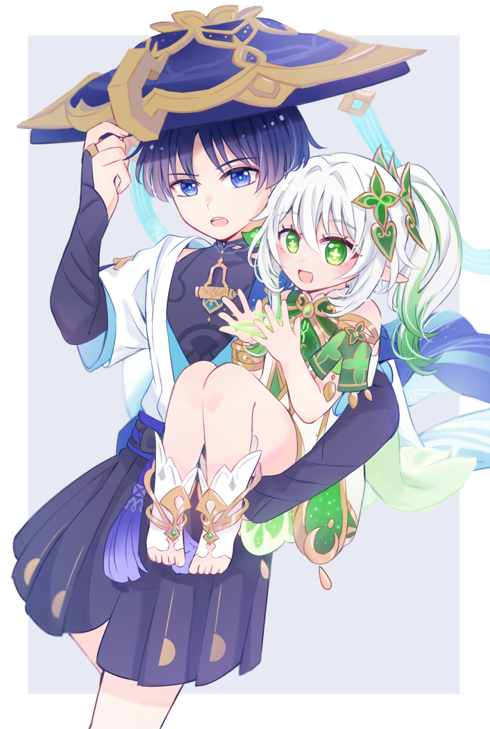 1boy 1girl anklet armlet bare_shoulders belt black_belt black_bodysuit black_bow black_bridal_gauntlets black_hair black_shorts blue_eyes blue_kimono blue_pupils blue_sleeves blunt_ends blush bodysuit border bow bracelet bridal_gauntlets bright_pupils carrying carrying_person cat's_cradle covered_collarbone cross-shaped_pupils detached_sleeves dress eyelashes eyeliner eyeshadow fingernails gem genshin_impact gold gold_ring gold_trim green_eyes green_gem green_hair green_sleeves hair_between_eyes hair_intakes hair_ornament hakama hakama_shorts han'eri hand_up hat holding holding_unworn_clothes holding_unworn_hat japanese_clothes jewelry jingasa kimono knees_up layered_kimono layered_sleeves leaf leaf_hair_ornament long_hair looking_at_another looking_at_hands makeup mandarin_collar middle_ring multicolored_hair nahida_(genshin_impact) nekozawa open_clothes open_hands open_kimono open_mouth pleated_shorts pointy_ears purple_hat purple_rope purple_sash red_eyeliner red_eyeshadow rope sash scaramouche_(genshin_impact) short_sleeves shorts shoulder_peek side_ponytail sidelocks socks streaked_hair symbol-shaped_pupils tareme teeth toeless_socks toes unworn_hat unworn_headwear upper_teeth_only wanderer_(genshin_impact) white_border white_dress white_hair white_kimono white_pupils white_sleeves white_socks