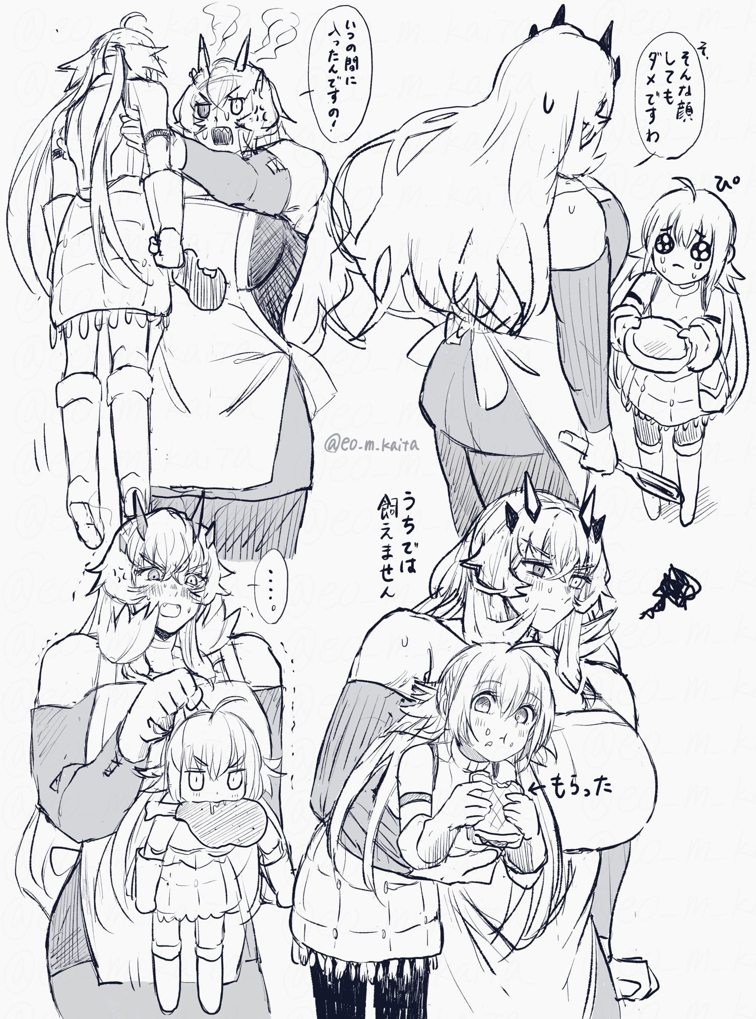 2girls apron artoria_caster_(fate) artoria_pendragon_(fate) bare_shoulders barghest_(fate) boots breasts carrying carrying_under_arm chibi dress eating fate/grand_order fate_(series) food gloves grey_background hair_between_eyes hat highres horns huge_breasts japanese_text kaita_(mokamilkcup) lifting_person long_hair monochrome multiple_girls off-shoulder_dress off_shoulder pantyhose pleading_eyes simple_background small_breasts sweater sweater_dress tall_female
