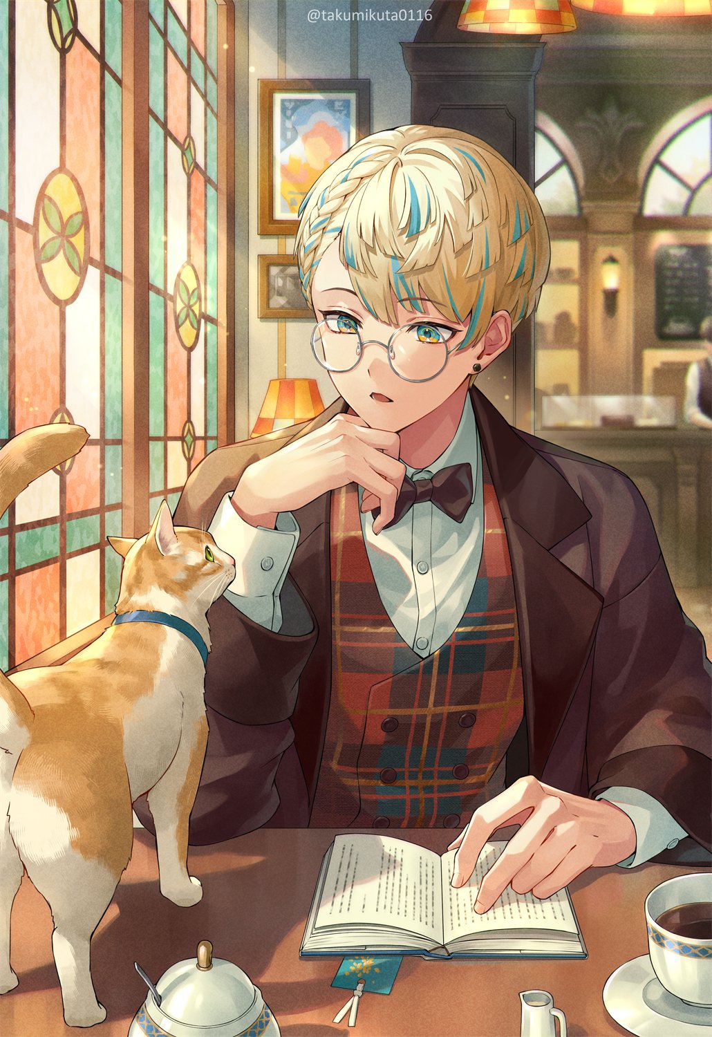 1boy artist_name blonde_hair blue_eyes blue_hair book bookmark bow bowtie braid brown_bow brown_bowtie brown_coat brown_vest buttons cafe cat chalkboard coat coffee coffee_mug collared_shirt commentary_request counter creamer_(vessel) cup display_case double-breasted earrings glasses hand_up hanging_light hibachi_mana hibachi_mana_(2nd_costume) highres indoors jewelry lamp lapels light_particles light_rays long_sleeves looking_at_animal male_focus menu_board mug multicolored_eyes multicolored_hair nijisanji official_alternate_costume open_book open_clothes open_coat open_mouth parted_bangs picture_frame plaid_clothes plaid_vest round_eyewear saucer shirt short_hair single_braid solo stained_glass streaked_hair sugar_bowl table takumi_(dnacometrue) twitter_username upper_body vest virtual_youtuber wall_lamp white_shirt window wing_collar yellow_eyes