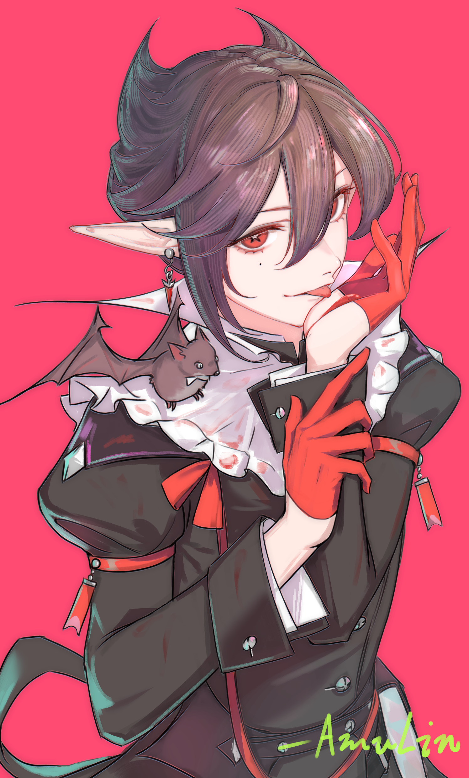 1girl :p absurdres animal animal_on_shoulder arknights artist_name bat_(animal) black_dress black_hair blood blood_on_clothes book closed_mouth commentary_request dress earrings entelechia_(arknights) gloves highres jewelry juliet_sleeves long_sleeves looking_at_viewer pointy_ears puffy_sleeves quietmrcat red_eyes red_gloves short_hair smile solo star-shaped_pupils star_(symbol) symbol-shaped_pupils tongue tongue_out upper_body