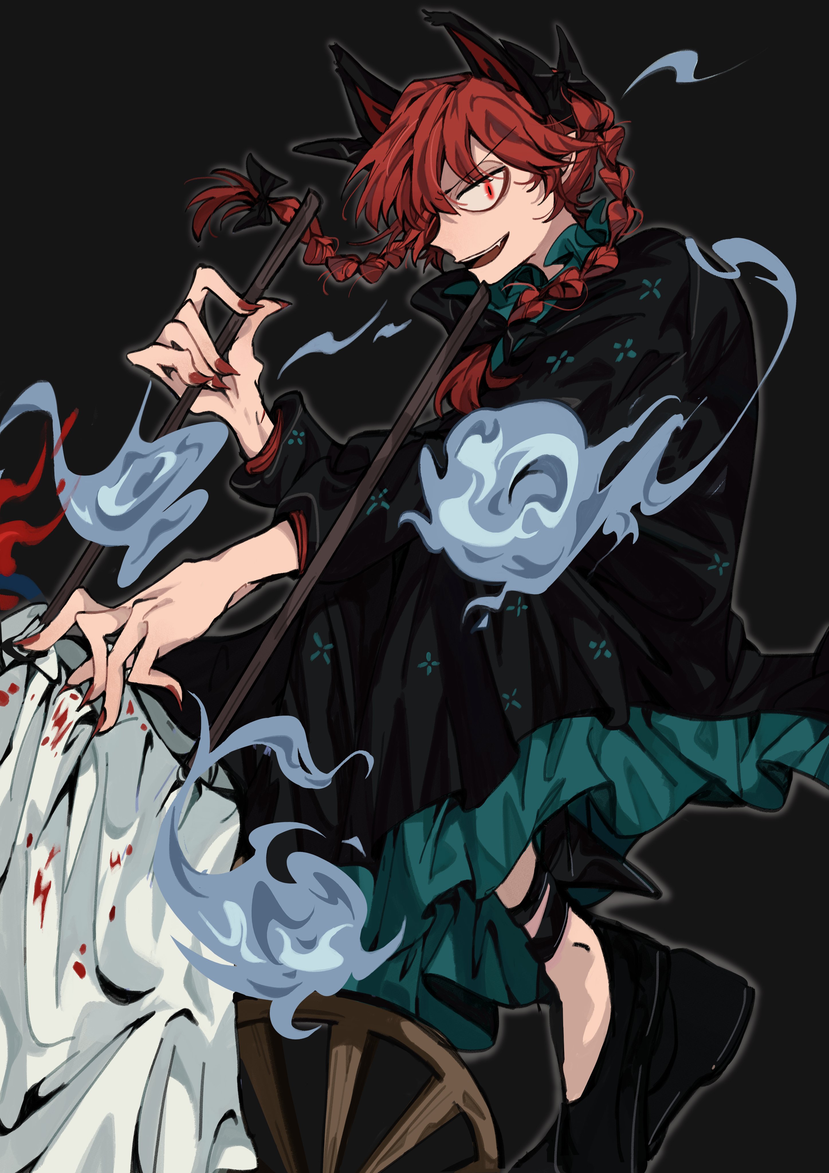 1girl absurdres black_background black_dress blood braid commentary dress full_body highres hitodama iampenguinj kaenbyou_rin looking_at_viewer open_mouth red_eyes red_hair red_nails side_braids simple_background solo untranslatable_commentary touhou twin_braids wheelbarrow