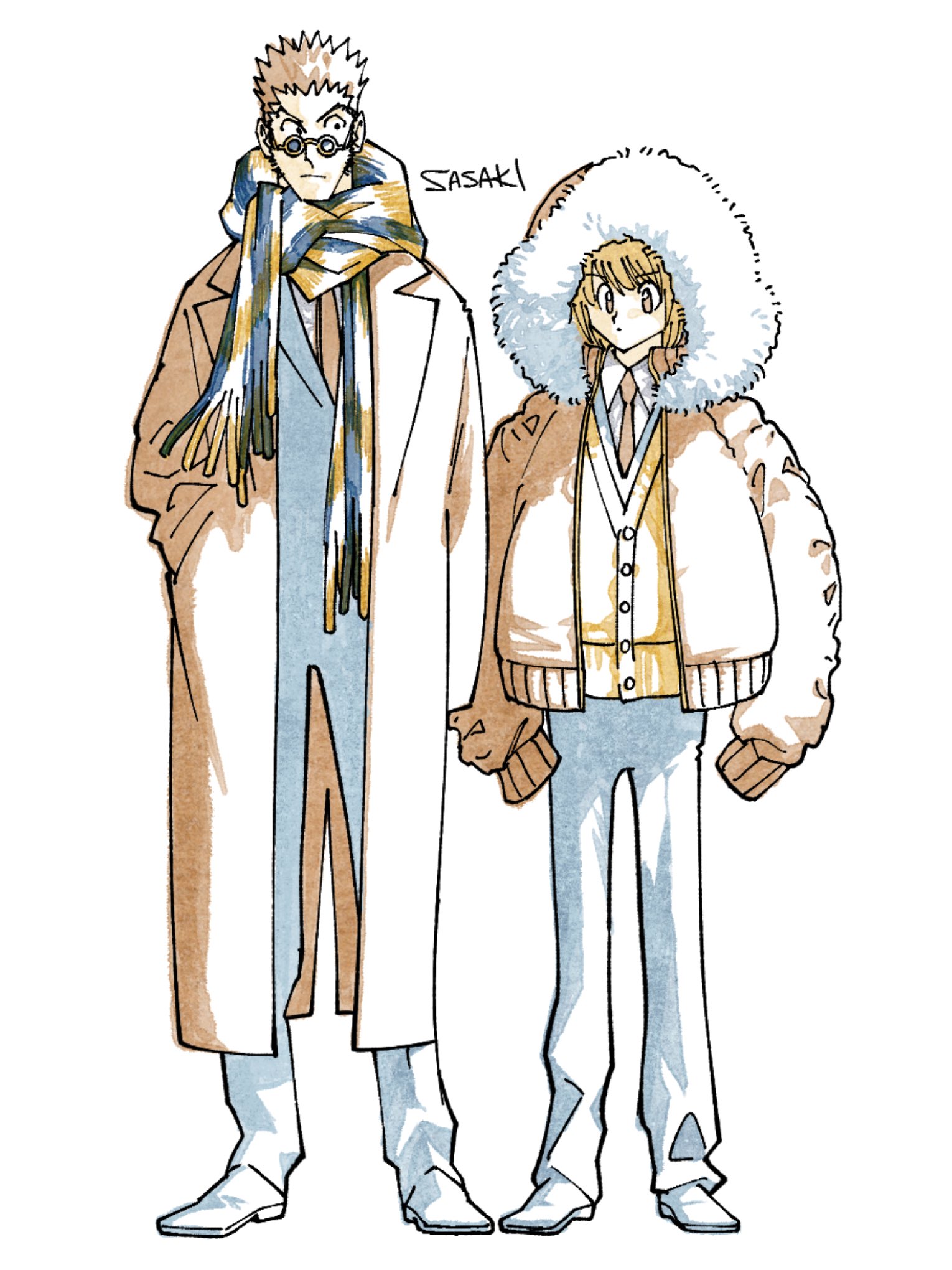 2boys alternate_costume blonde_hair blue_pants blue_shoes blue_suit brown_coat brown_eyes brown_hair brown_necktie coat collared_shirt formal_clothes full_body fur_hood highres hunter_x_hunter kurapika leorio_paladiknight limited_palette looking_at_another looking_at_viewer male_focus multiple_boys necktie pants round_eyewear sasaki_koguma scarf shirt shoes short_hair simple_background sleeves_past_fingers sleeves_past_wrists spiked_hair standing striped_clothes striped_scarf suit sunglasses white_background yellow_shirt
