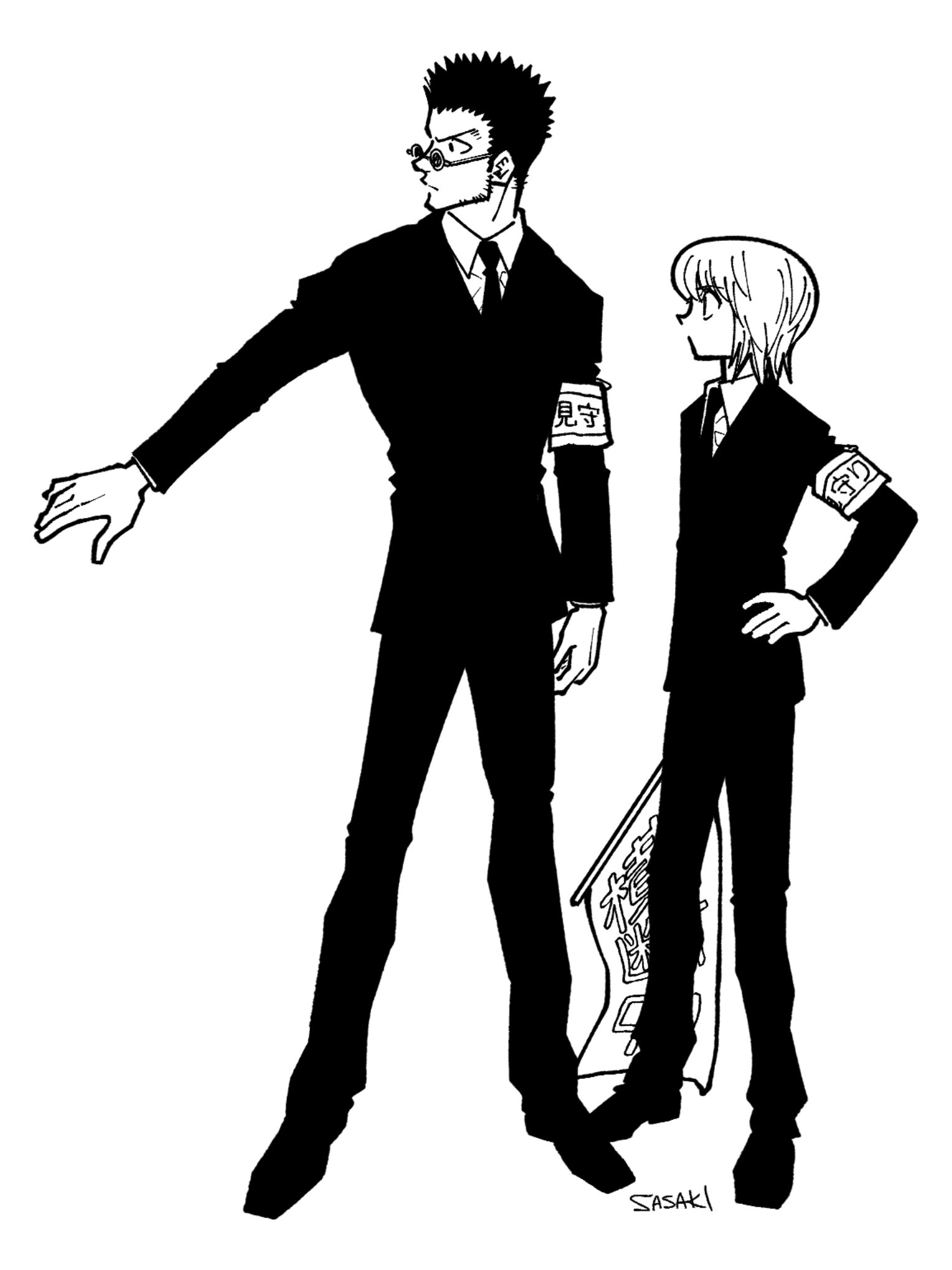 2boys armband black_suit collared_shirt flag formal_clothes full_body greyscale hand_on_own_hip highres holding holding_flag hunter_x_hunter kurapika leorio_paladiknight long_sleeves looking_at_another male_focus monochrome multiple_boys necktie round_eyewear sasaki_koguma shirt short_hair simple_background spiked_hair standing suit white_background