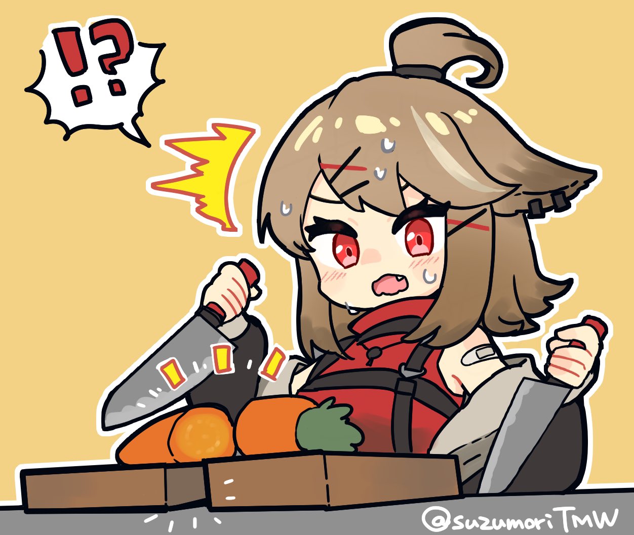 !? 1girl ^^^ animal_ear_piercing animal_ears arknights black_jacket blush breasts brown_background brown_hair carrot commentary_request cutter_(arknights) cutting_board dual_wielding ear_piercing fang hair_ornament hairclip holding holding_knife jacket knife long_sleeves medium_breasts notice_lines off_shoulder one-hour_drawing_challenge open_clothes open_jacket open_mouth piercing puffy_long_sleeves puffy_sleeves red_eyes red_shirt shirt simple_background sleeveless sleeveless_shirt solo spoken_interrobang suzumori_(suzumoritmw) sweat topknot twitter_username upper_body wavy_mouth x_hair_ornament