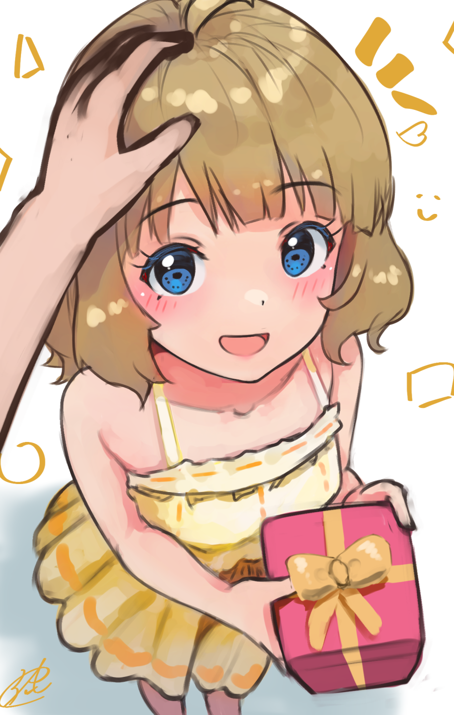 1boy 1girl ahoge bare_shoulders blue_eyes blush box brown_hair c_(theta) collarbone commentary_request dress from_above gift gift_box headpat highres holding holding_gift idolmaster idolmaster_million_live! looking_at_viewer looking_up open_mouth pov pov_hands short_hair sleeveless sleeveless_dress smile solo_focus sundress suou_momoko wavy_hair white_background yellow_dress