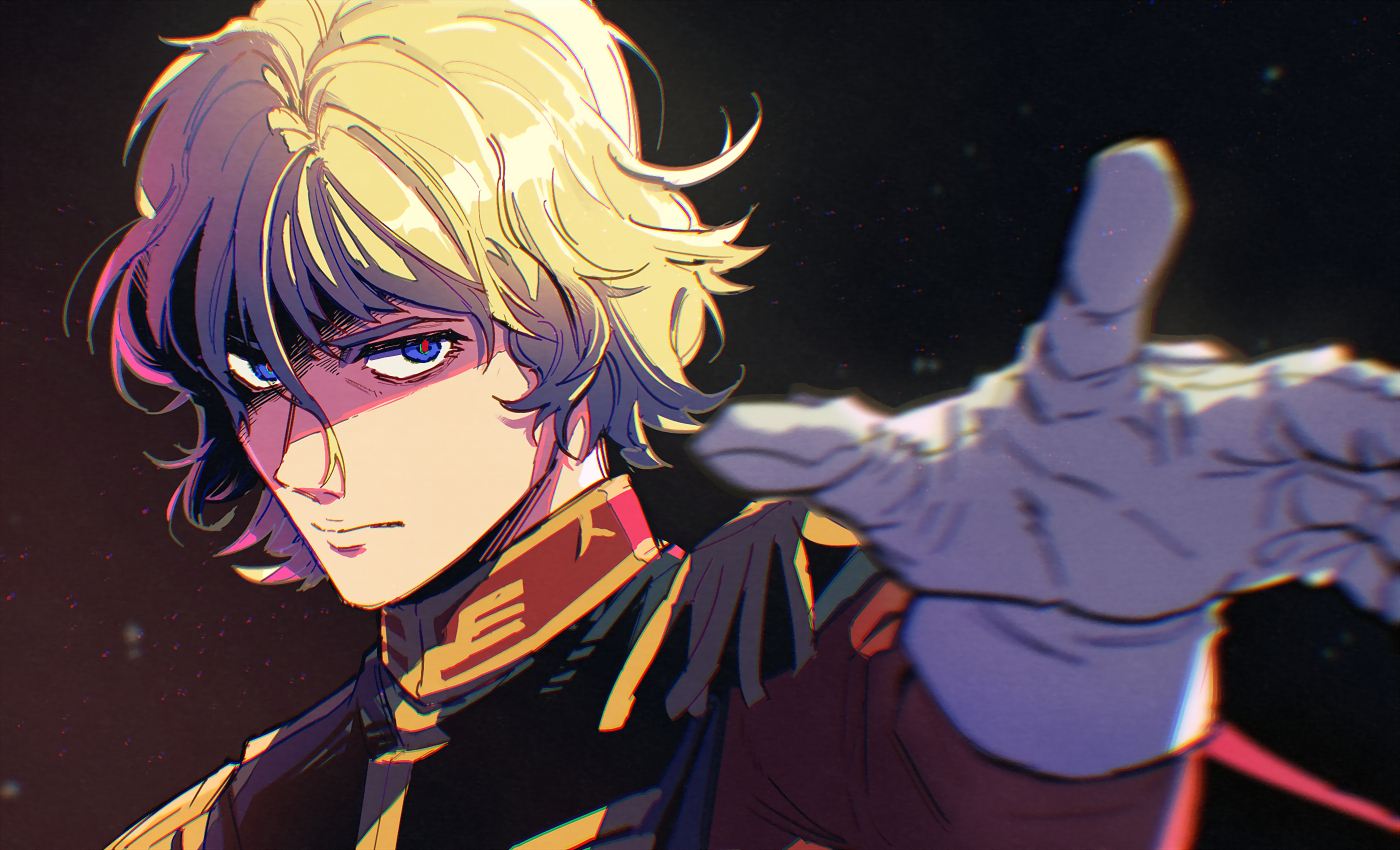 1boy black_background blonde_hair blue_eyes char_aznable gloves gundam high_collar jacket long_sleeves looking_at_viewer male_focus military_uniform mobile_suit_gundam outstretched_hand partially_shaded_face sa1korokorokoro serious short_hair solo upper_body white_gloves
