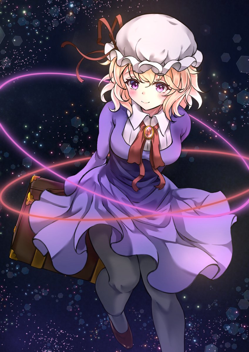 1girl black_leggings black_shoes breasts brooch closed_mouth collar commentary_request commission dress floating_clothes from_above hair_between_eyes hat hat_ribbon hato_maron highres holding holding_behind_back holding_suitcase jewelry large_breasts leggings light_blush maribel_hearn messy_hair mob_cap neck_ribbon orbital_path profile_picture purple_dress purple_eyes red_ribbon ribbon second-party_source shoes short_hair smile solo space star_(sky) suitcase swept_bangs touhou white_collar white_hat