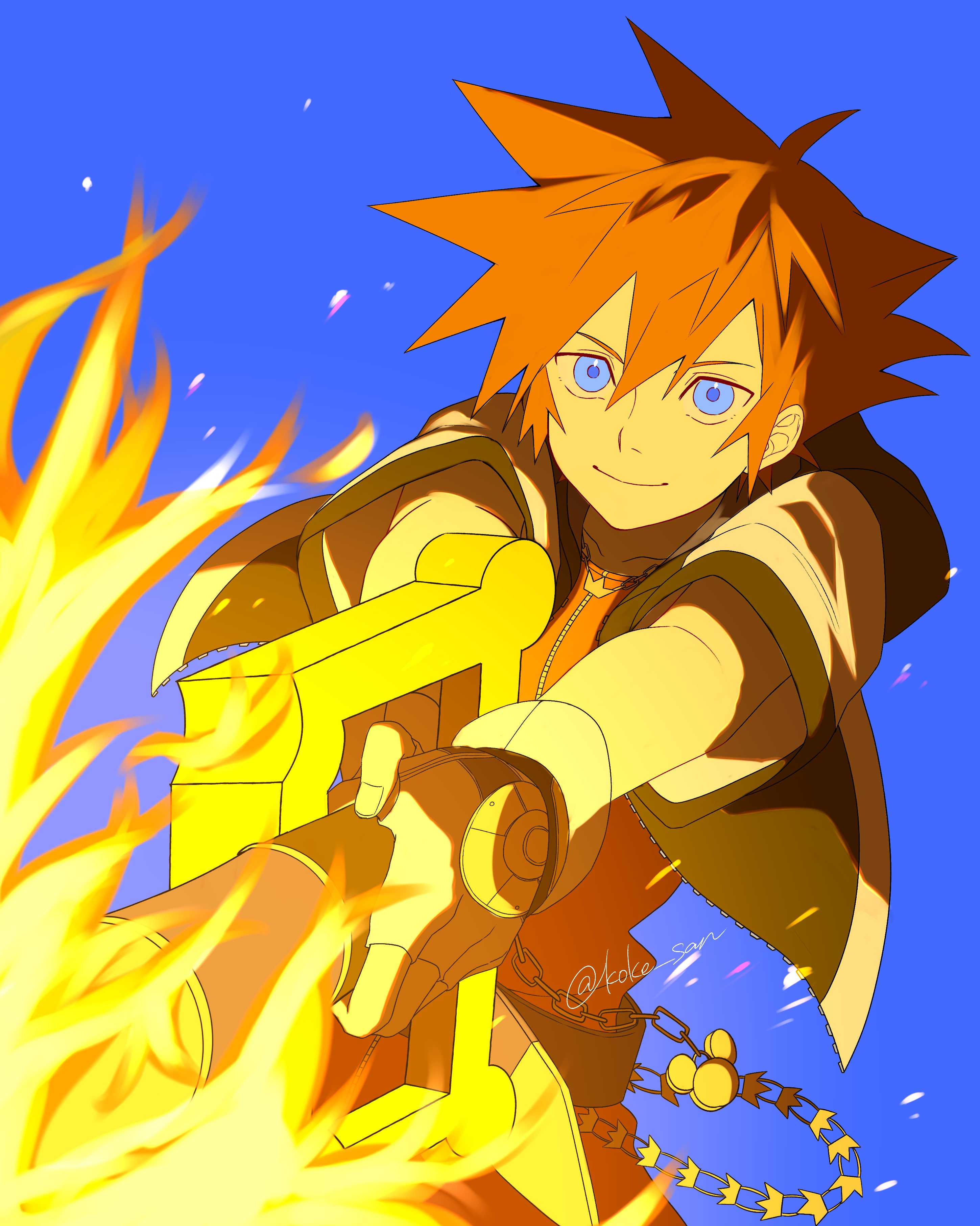 1boy absurdres blue_background blue_eyes brown_hair chain chain_necklace crown_(symbol) fingerless_gloves fire gloves highres holding hood jewelry keyblade kingdom_hearts male_focus necklace nori_(koke_sr) pants short_hair smile sora_(kingdom_hearts) spiked_hair