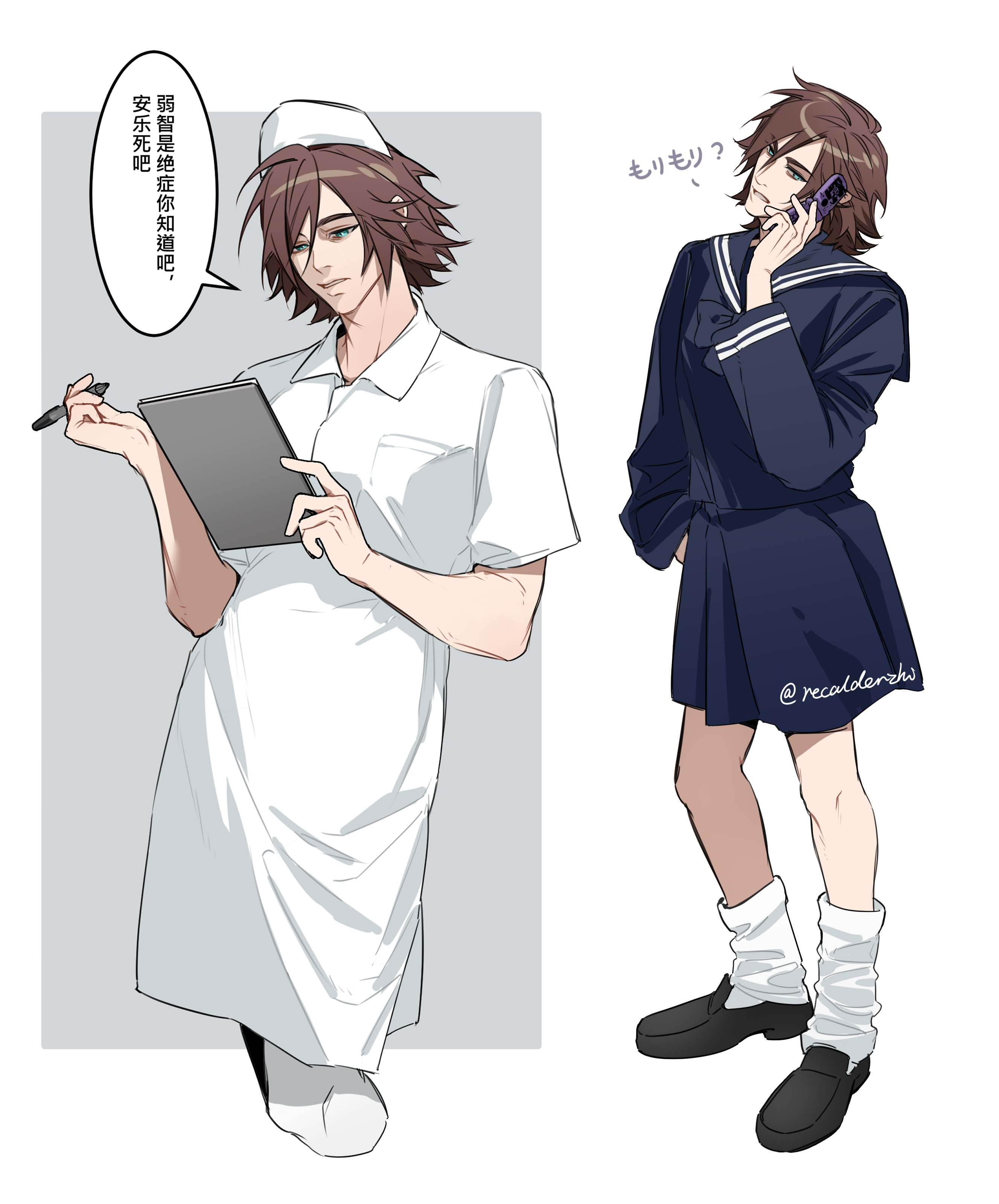 1boy absurdres alternate_costume blue_eyes blue_sailor_collar blue_skirt brown_hair cellphone clipboard crossdressing crossdressing_(mtf) final_fantasy final_fantasy_vii genesis_rhapsodos hat highres holding holding_clipboard holding_phone leg_warmers male_focus multiple_views nurse nurse_cap phone recalderzhi sailor_collar school_uniform skirt speech_bubble talking_on_phone twitter_username white_leg_warmers