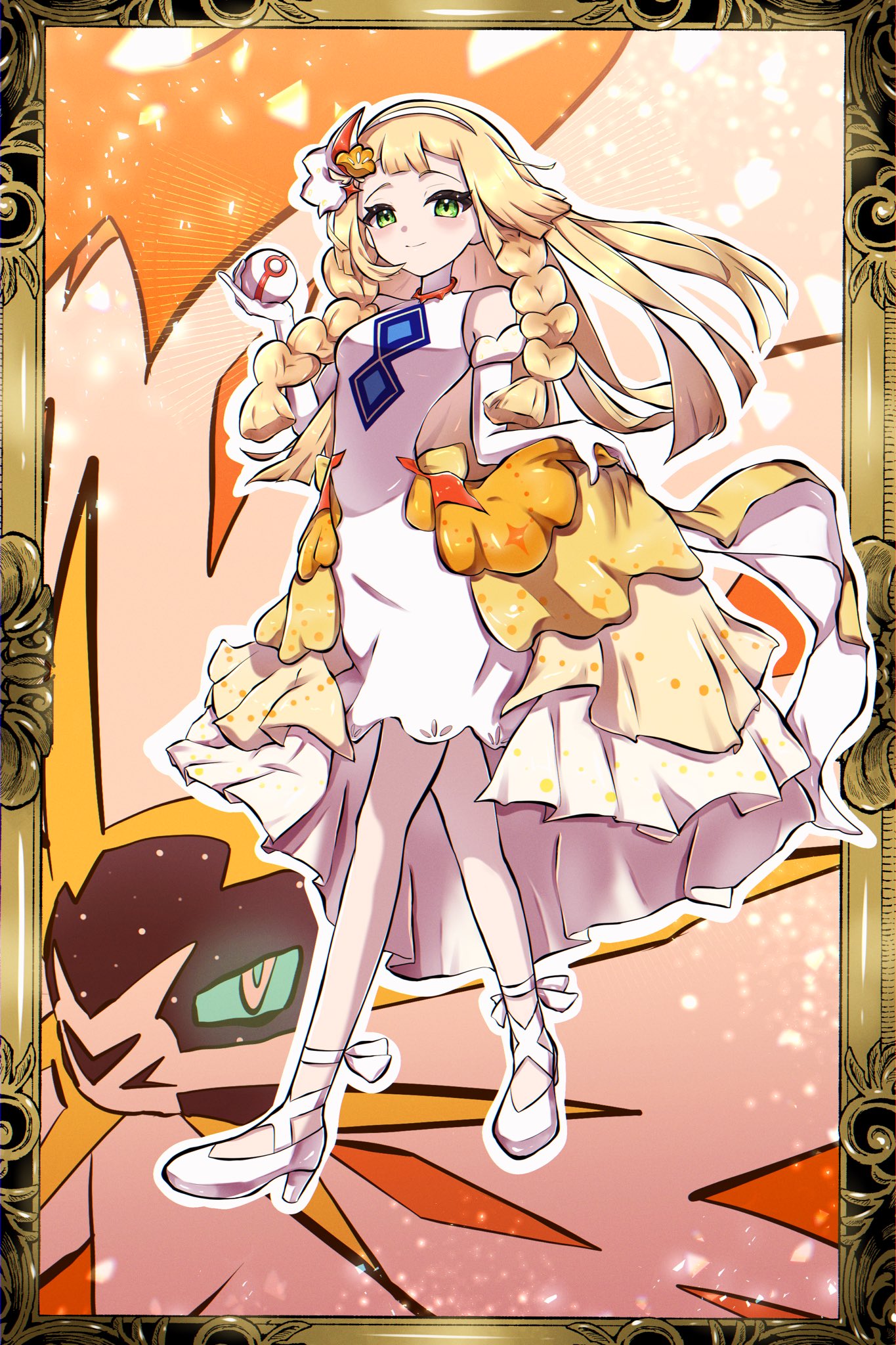 1girl :d bare_shoulders blonde_hair braid dress elbow_gloves full_body gen_7_pokemon gloves green_eyes hairband highres holding holding_own_dress holding_poke_ball legendary_pokemon lillie_(anniversary_2024)_(pokemon) lillie_(pokemon) lion long_hair looking_at_viewer nintendo official_alternate_costume open_mouth poke_ball pokemon pokemon_(creature) pokemon_masters_ex premier_ball sino_(pcxg4558) smile solgaleo solo_focus twin_braids twitter_username white_dress white_gloves white_hairband white_high_heels