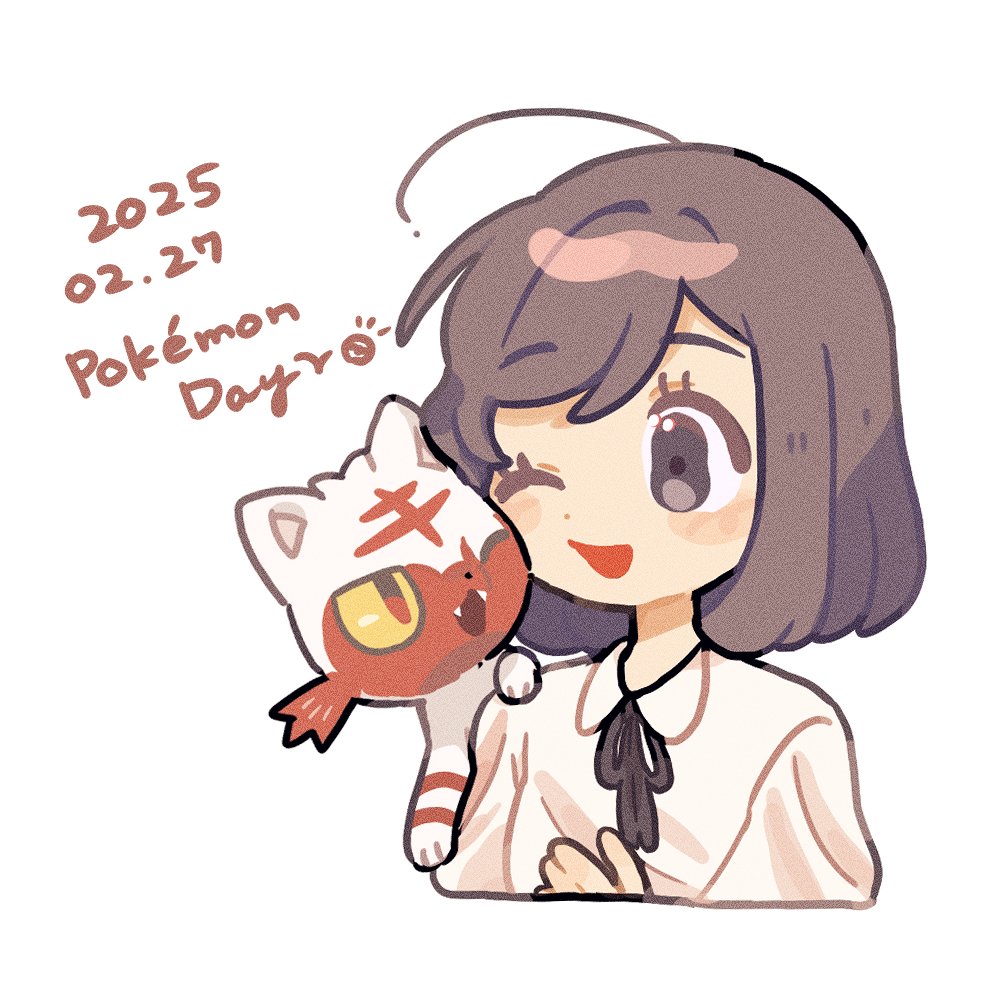 1girl ;d alternate_color brown_eyes brown_hair collared_shirt daifuku_(pokefuka_art) dated eyelashes gen_7_pokemon happy litten medium_hair neck_ribbon nintendo on_shoulder one_eye_closed open_mouth pokemon pokemon_(creature) pokemon_day pokemon_on_shoulder ribbon shiny_pokemon shirt simple_background smile white_background white_shirt