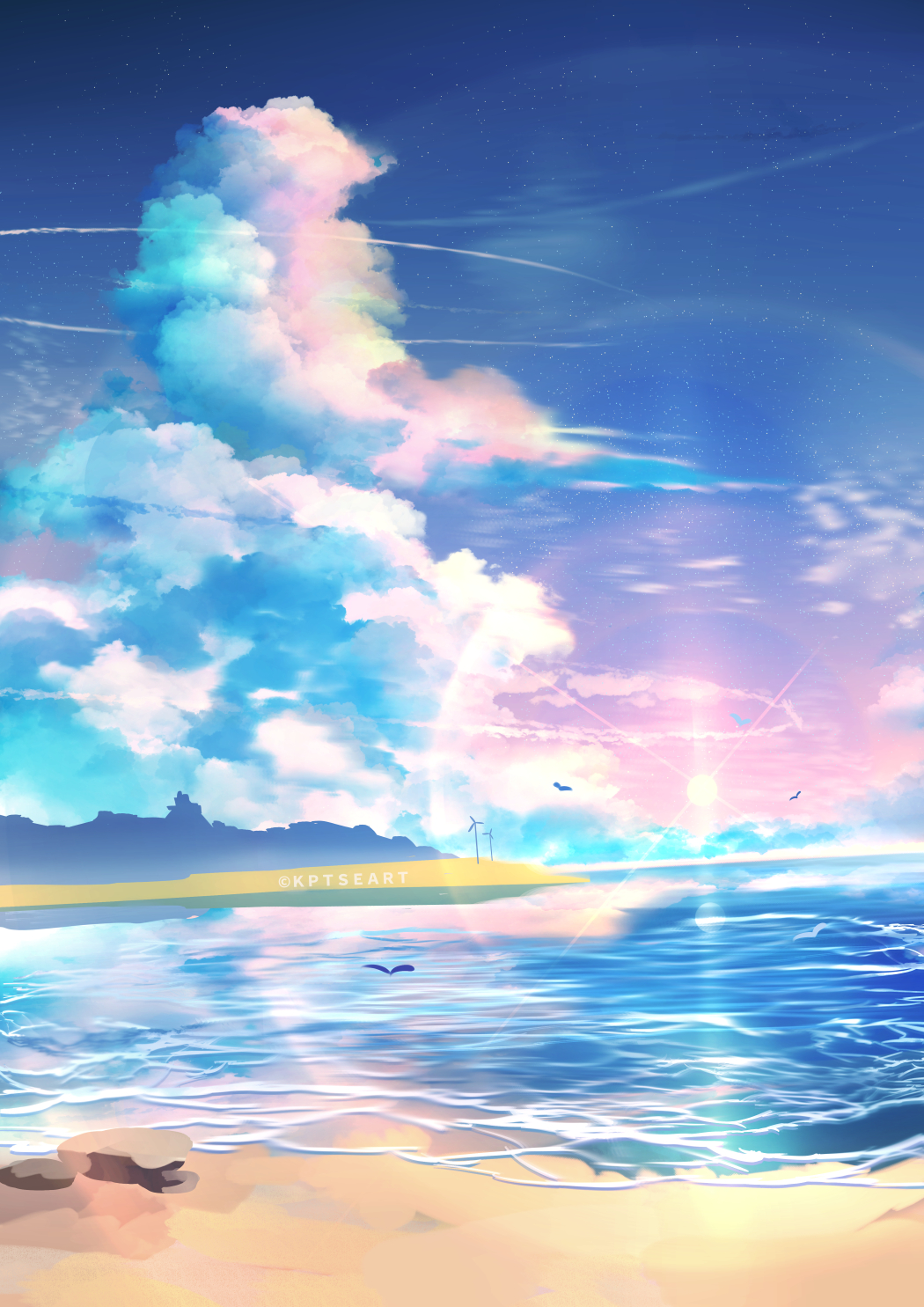 artist_name beach blue_sky cloud cumulonimbus_cloud highres horizon k&p_(kptseart) landscape no_humans ocean original outdoors scenery sky sun sunlight