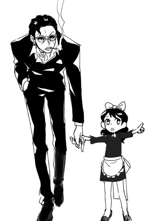 1boy 1girl aged_down apron baby_5 bow child cigarette commentary_request dress formal_clothes greyscale hair_bow hair_slicked_back hand_in_pocket korean_commentary long_hair mango_wa monochrome one_piece pointing senor_pink short_hair simple_background smoke suit sunglasses v-shaped_eyebrows