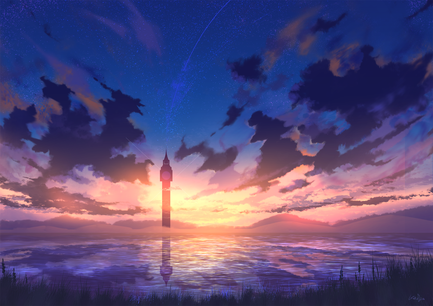 artist_name cloud dawn horizon k&p_(kptseart) lake landscape no_humans original scenery star_(sky) tower