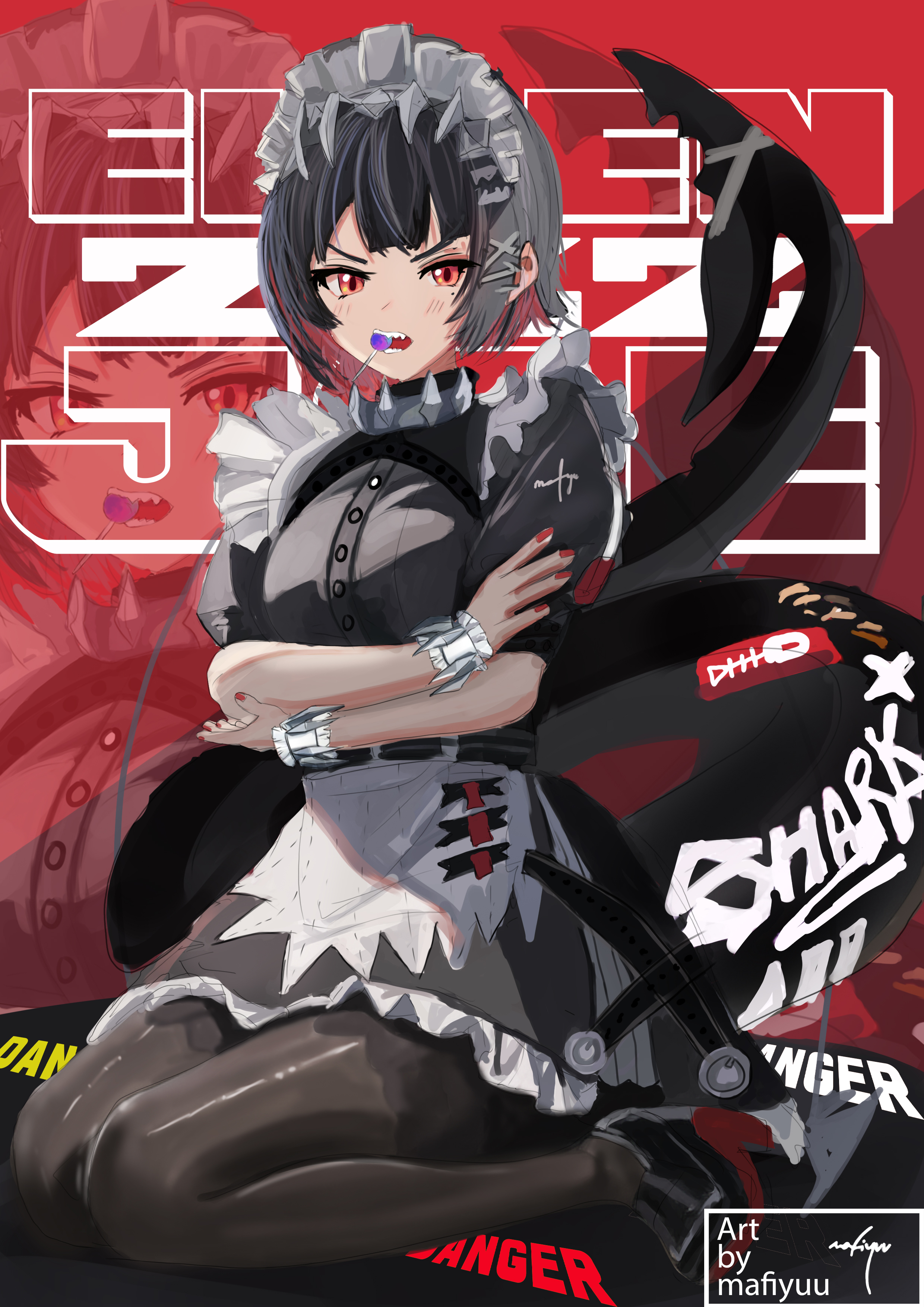 1girl absurdres black_dress black_hair black_pantyhose character_name copyright_name crossed_arms dress ellen_joe fins fish_tail full_body highres lizelotte looking_at_viewer maid maid_headdress on_floor pantyhose red_eyes red_hair shark_girl shark_tail sharp_teeth short_hair solo tail teeth very_long_tail zenless_zone_zero zoom_layer