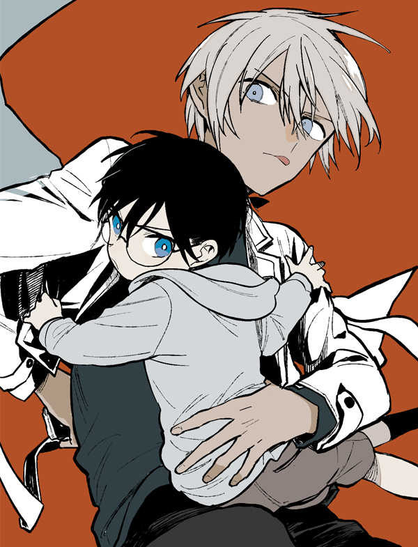 2boys :p akio_(89e) amuro_tooru black_hair black_pants blonde_hair blue_eyes brown_shorts carrying carrying_person commentary_request edogawa_conan floating_clothes grey_hoodie hair_between_eyes holding hood hood_down hoodie jacket lapels looking_back looking_to_the_side male_focus meitantei_conan multiple_boys notched_lapels open_clothes open_jacket orange_background pants short_hair shorts sideways_glance tongue tongue_out white_jacket