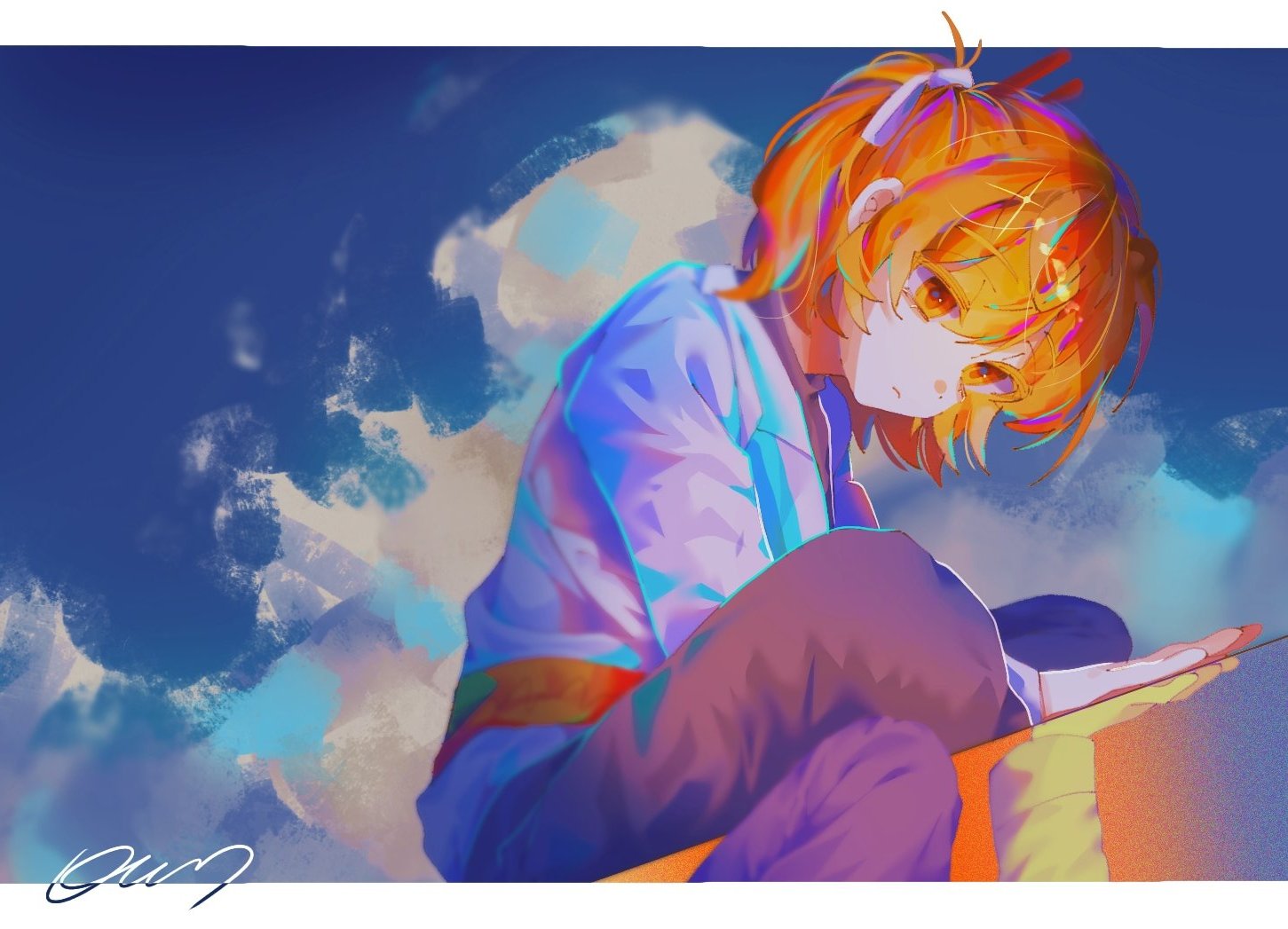 1girl a.i._voice adachi_rei baekcaffeine black_pants black_shirt blue_sky cloud gloves hair_between_eyes hair_ribbon jacket long_sleeves open_clothes open_jacket orange_eyes orange_hair pants radio_antenna ribbon shirt sitting sky solo utau white_gloves white_jacket white_ribbon