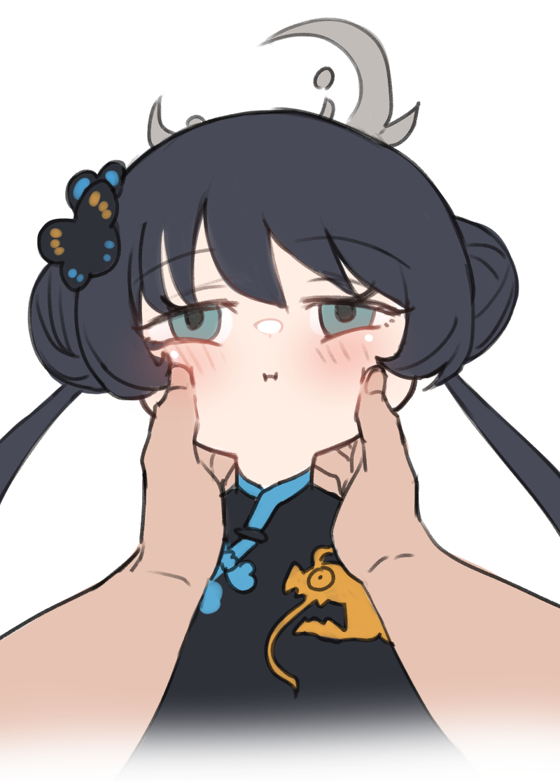 1girl black_hair blue_archive blush butterfly_hair_ornament cheek_pinching closed_mouth double_bun grey_eyes grey_halo hair_bun hair_ornament halo kisaki_(blue_archive) moonjunk pinching portrait pov solo_focus twintails white_background